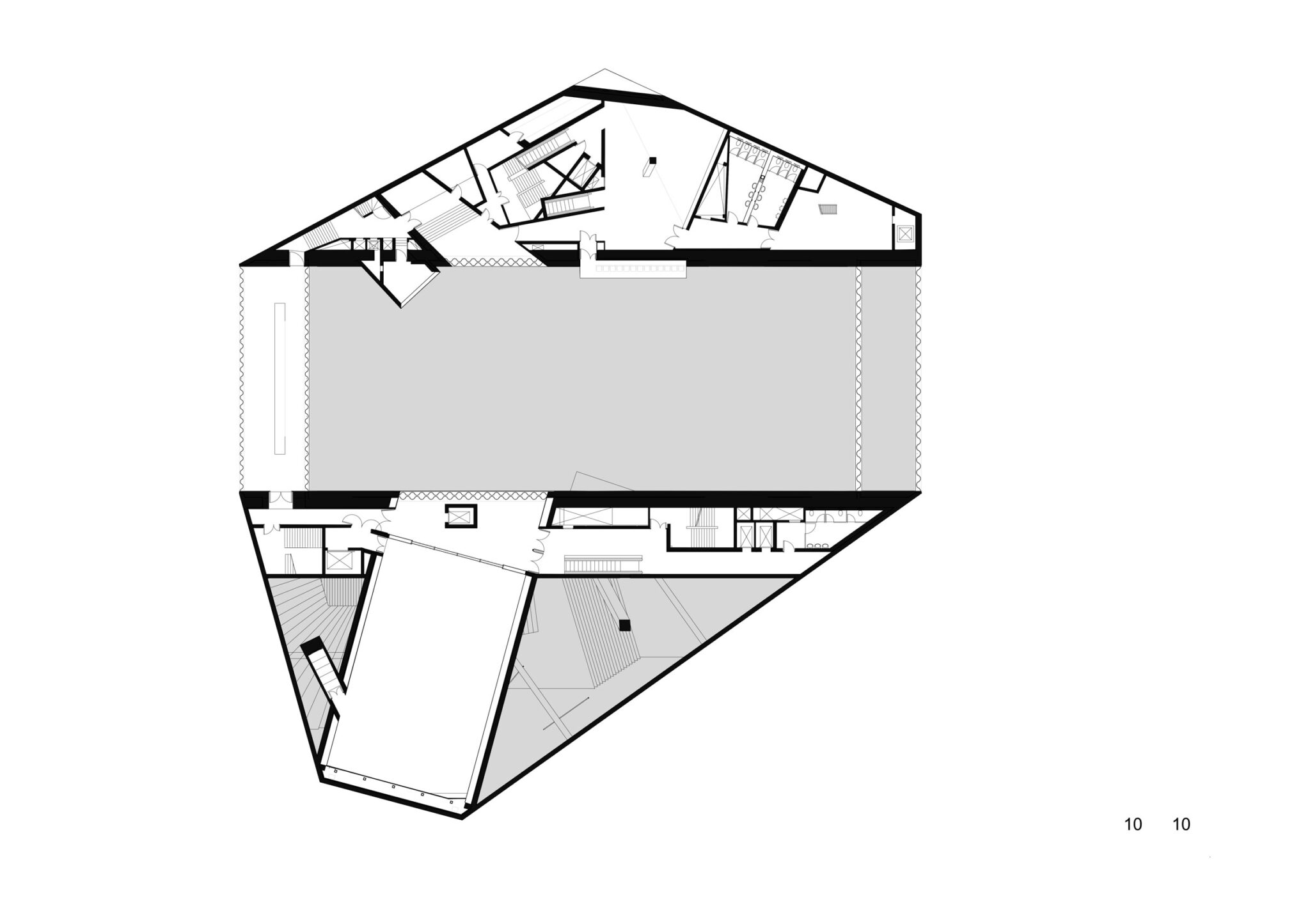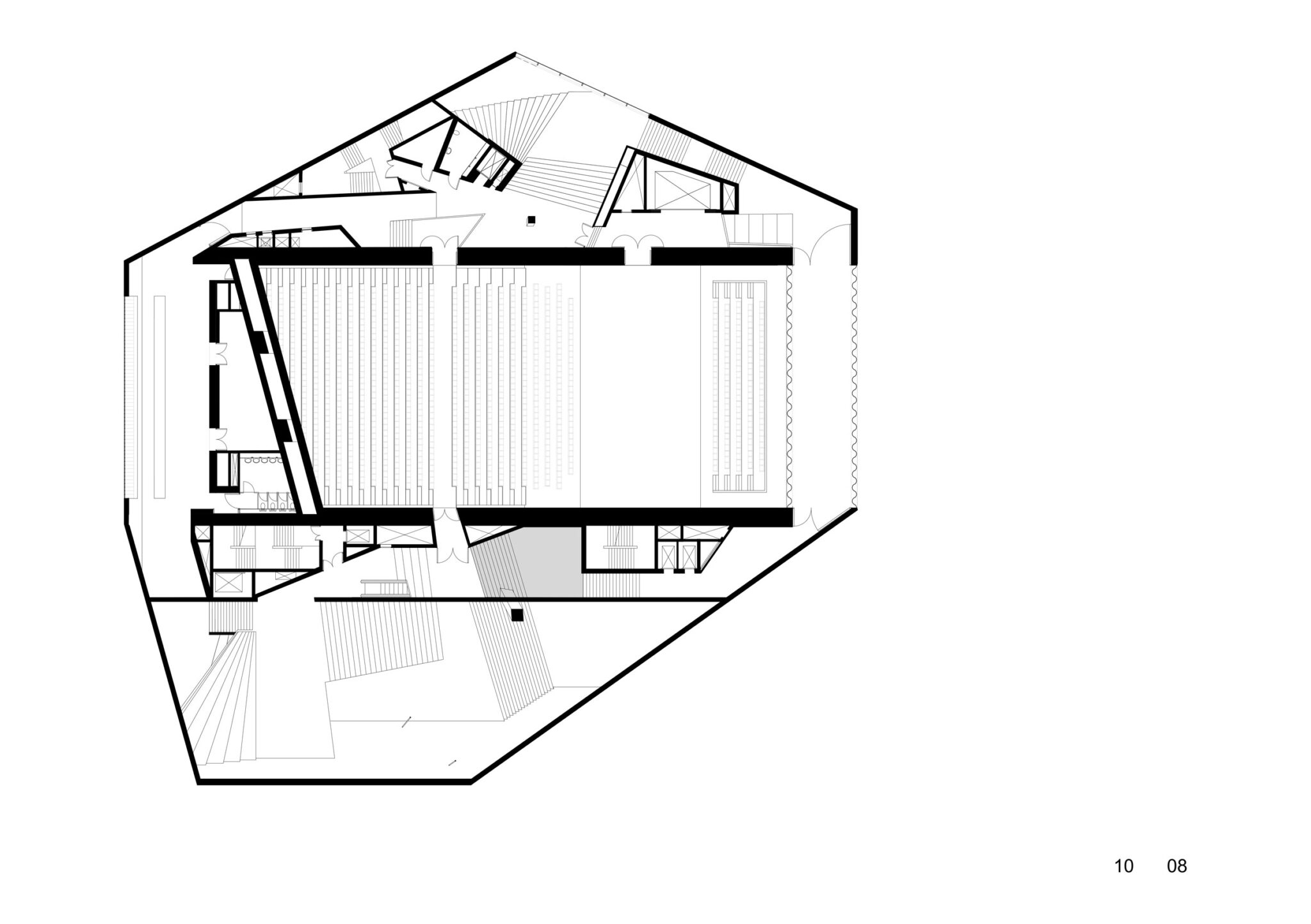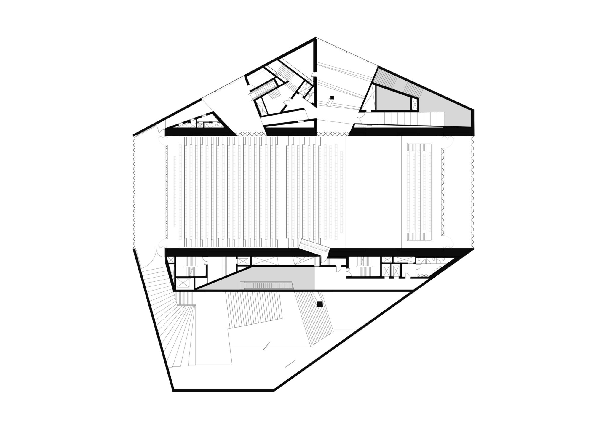露出された公共機能のあいだにある「残余の空間」は、ホワイエ、レストラン、テラス、技術スペース、そして垂直動線といった二次的なサービス空間を構成しています。