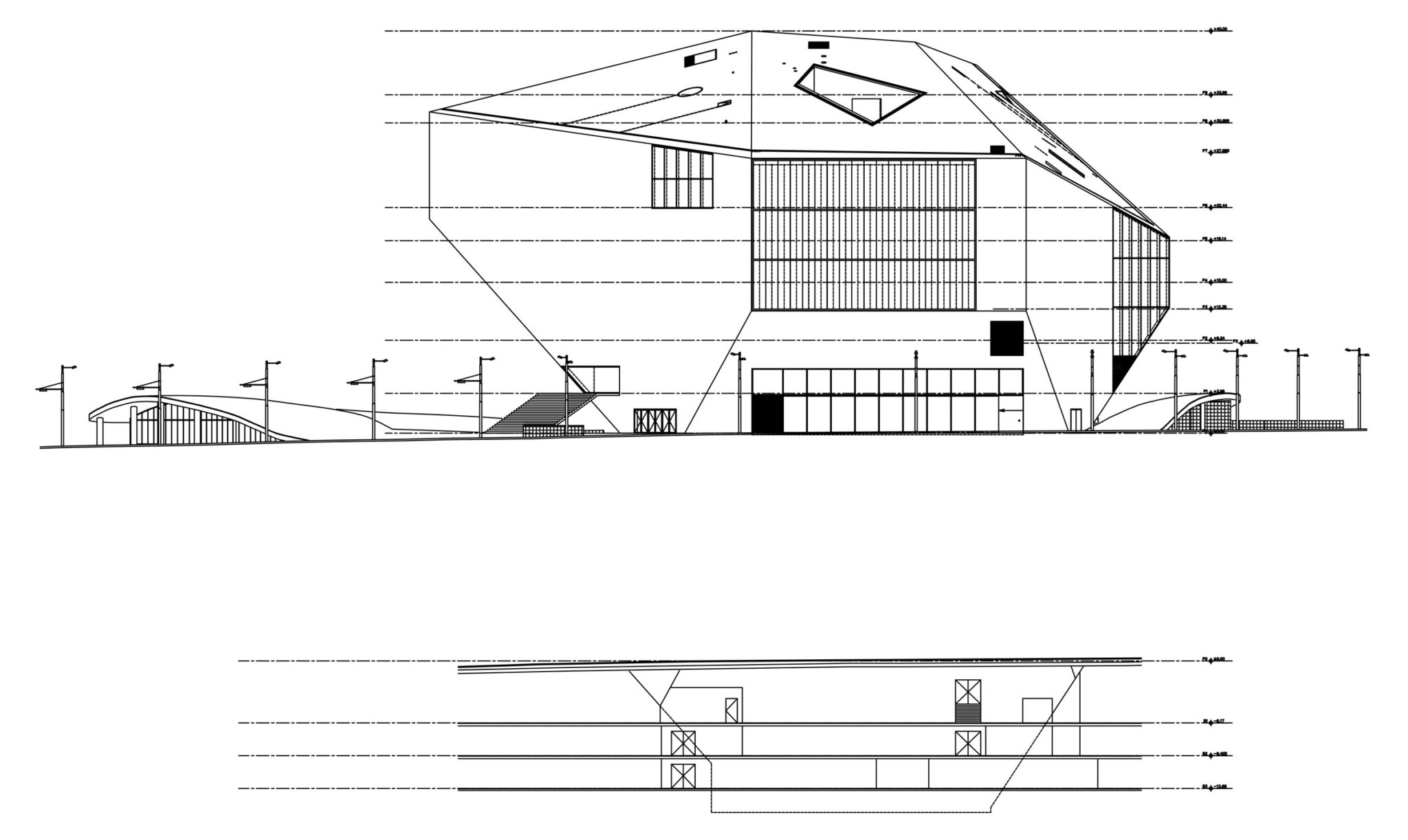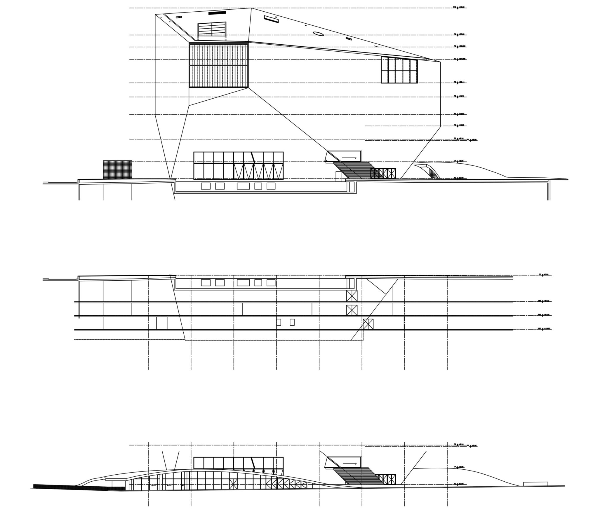 A continuous public route connects all public functions and “remaining spaces” located around the Grand Auditorium by means of stairs, platforms and escalators: the building becomes an architectural adventure. The loop creates the possibility to use the building for festivals with simultaneous performances; the House of Music.