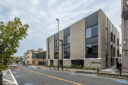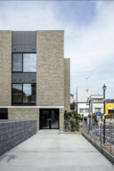 駅前のバスターミナルと通りに面した店舗併設の集合住宅です。建築家は、ランドマークであり2つの用途が“協調しあう”在り方を目指し、外周の構造壁を千鳥状にずらして重ねる外観を考案しました。また、街への貢献も意図し滞在空間等を設けています。