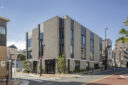 向山博 / 向山建築設計事務所による、東京の「三鷹台ストリート」。駅前のバスターミナルと通りに面した店舗併設の集合住宅。ランドマークであり2つの用途が“協調しあう”在り方を目指し、外周の構造壁を千鳥状にずらして重ねる外観を考案。街への貢献も意図し滞在空間等を設ける外観、北東のターミナル側より見る。(建築家による解説:解放されている階段を上ると住戸入口、隣接した駐車場、駐輪場にアプローチできる。写真左手は店舗利用者に開放されているテラス) photo©小出薫