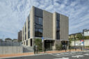 向山博 / 向山建築設計事務所による、東京の「三鷹台ストリート」。駅前のバスターミナルと通りに面した店舗併設の集合住宅。ランドマークであり2つの用途が“協調しあう”在り方を目指し、外周の構造壁を千鳥状にずらして重ねる外観を考案。街への貢献も意図し滞在空間等を設ける外観、北側の交差点より見る。 photo©小出薫