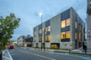 向山博 / 向山建築設計事務所による、東京の「三鷹台ストリート」。駅前のバスターミナルと通りに面した店舗併設の集合住宅。ランドマークであり2つの用途が“協調しあう”在り方を目指し、外周の構造壁を千鳥状にずらして重ねる外観を考案。街への貢献も意図し滞在空間等を設ける外観、北西側の道路より見る。夕景 photo©小出薫