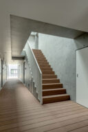 向山博 / 向山建築設計事務所による、東京の「三鷹台ストリート」。駅前のバスターミナルと通りに面した店舗併設の集合住宅。ランドマークであり2つの用途が“協調しあう”在り方を目指し、外周の構造壁を千鳥状にずらして重ねる外観を考案。街への貢献も意図し滞在空間等を設ける1階、集合住宅の共用階段から2階の廊下を見る。(建築家による解説:デッキ下は配管スペース。メンテナンスが容易) photo©小出薫
