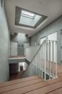 向山博 / 向山建築設計事務所による、東京の「三鷹台ストリート」。駅前のバスターミナルと通りに面した店舗併設の集合住宅。ランドマークであり2つの用途が“協調しあう”在り方を目指し、外周の構造壁を千鳥状にずらして重ねる外観を考案。街への貢献も意図し滞在空間等を設ける2階、共用廊下から3階への階段を見る。(建築家による解説:3階のトップライトから光が注がれる) photo©小出薫