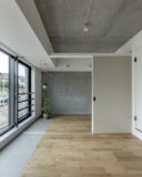 向山博 / 向山建築設計事務所による、東京の「三鷹台ストリート」。駅前のバスターミナルと通りに面した店舗併設の集合住宅。ランドマークであり2つの用途が“協調しあう”在り方を目指し、外周の構造壁を千鳥状にずらして重ねる外観を考案。街への貢献も意図し滞在空間等を設ける3階、住戸304号室(建築家による解説:回遊性のある間取。奥の玄関と手前寝室の間に水回りがある。普段は廊下、玄関側と寝室側の引戸を閉めると脱衣室となる) photo©小出薫