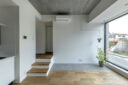 向山博 / 向山建築設計事務所による、東京の「三鷹台ストリート」。駅前のバスターミナルと通りに面した店舗併設の集合住宅。ランドマークであり2つの用途が“協調しあう”在り方を目指し、外周の構造壁を千鳥状にずらして重ねる外観を考案。街への貢献も意図し滞在空間等を設ける3階、住戸306号室(建築家による解説:小上がりから見る) photo©小出薫