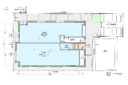 向山博 / 向山建築設計事務所による、東京の「三鷹台ストリート」。駅前のバスターミナルと通りに面した店舗併設の集合住宅。ランドマークであり2つの用途が“協調しあう”在り方を目指し、外周の構造壁を千鳥状にずらして重ねる外観を考案。街への貢献も意図し滞在空間等を設ける1階平面図 image©向山建築設計事務所