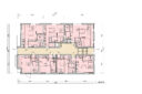 向山博 / 向山建築設計事務所による、東京の「三鷹台ストリート」。駅前のバスターミナルと通りに面した店舗併設の集合住宅。ランドマークであり2つの用途が“協調しあう”在り方を目指し、外周の構造壁を千鳥状にずらして重ねる外観を考案。街への貢献も意図し滞在空間等を設ける2階、住戸202号室(建築家による解説:共用廊下より住戸内が低く、天井高が確保されている) photo©小出薫