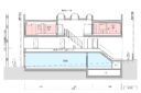 向山博 / 向山建築設計事務所による、東京の「三鷹台ストリート」。駅前のバスターミナルと通りに面した店舗併設の集合住宅。ランドマークであり2つの用途が“協調しあう”在り方を目指し、外周の構造壁を千鳥状にずらして重ねる外観を考案。街への貢献も意図し滞在空間等を設ける断面図 image©向山建築設計事務所