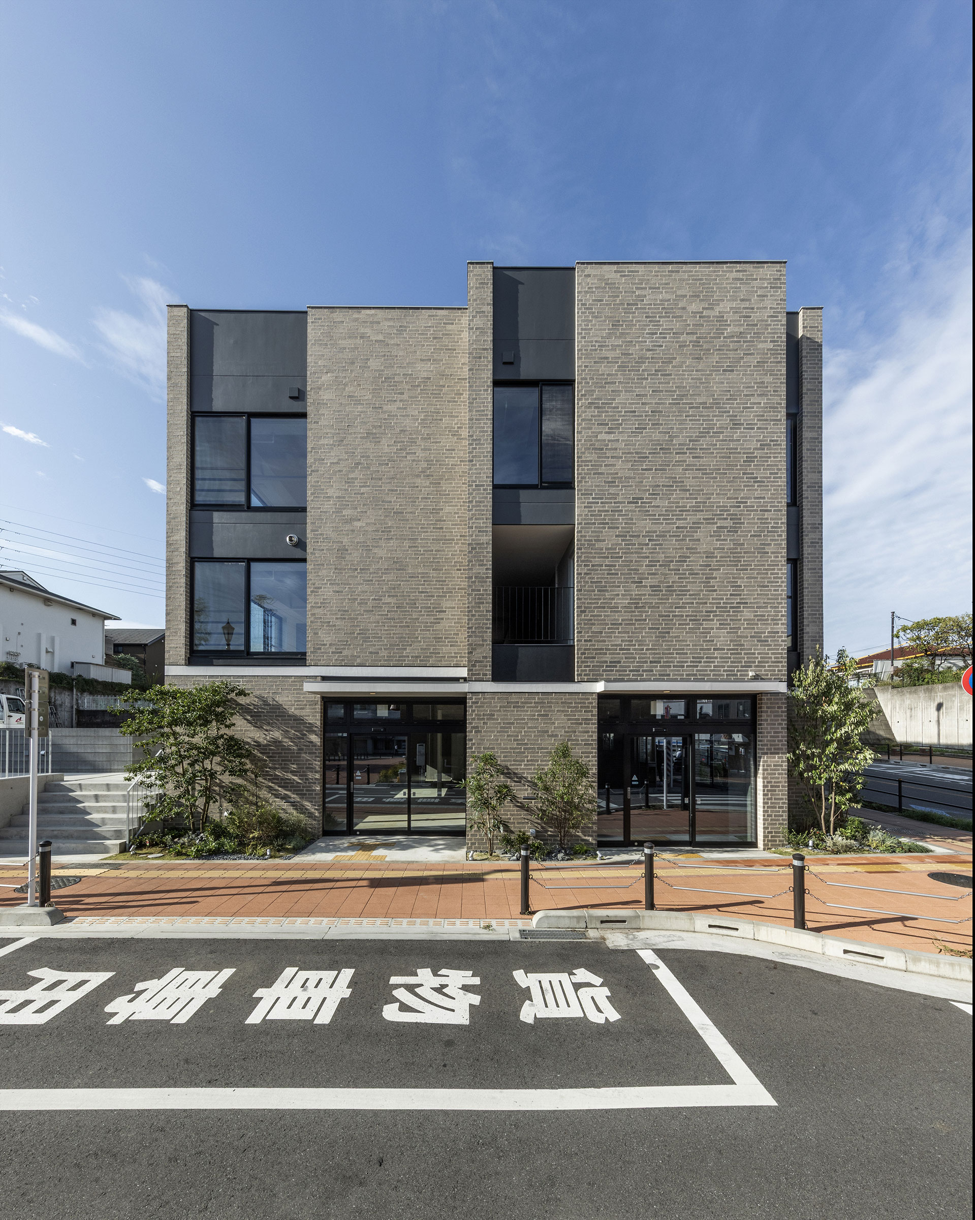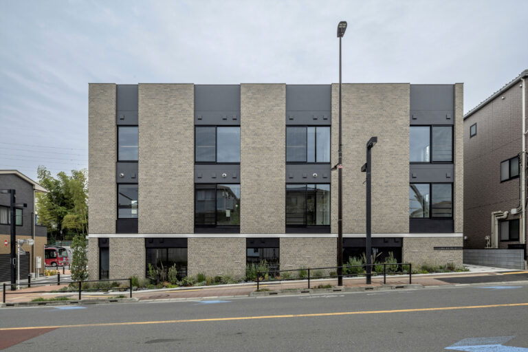 店舗と住戸の二つの用途が同一の建物を共有、協調しあうような外観を目指した。煉瓦タイルで仕上げた構造壁を店舗階と住戸階で千鳥状にずらし重ねた。用途の違いを明確にしつつ、協調しあう関係を表している。