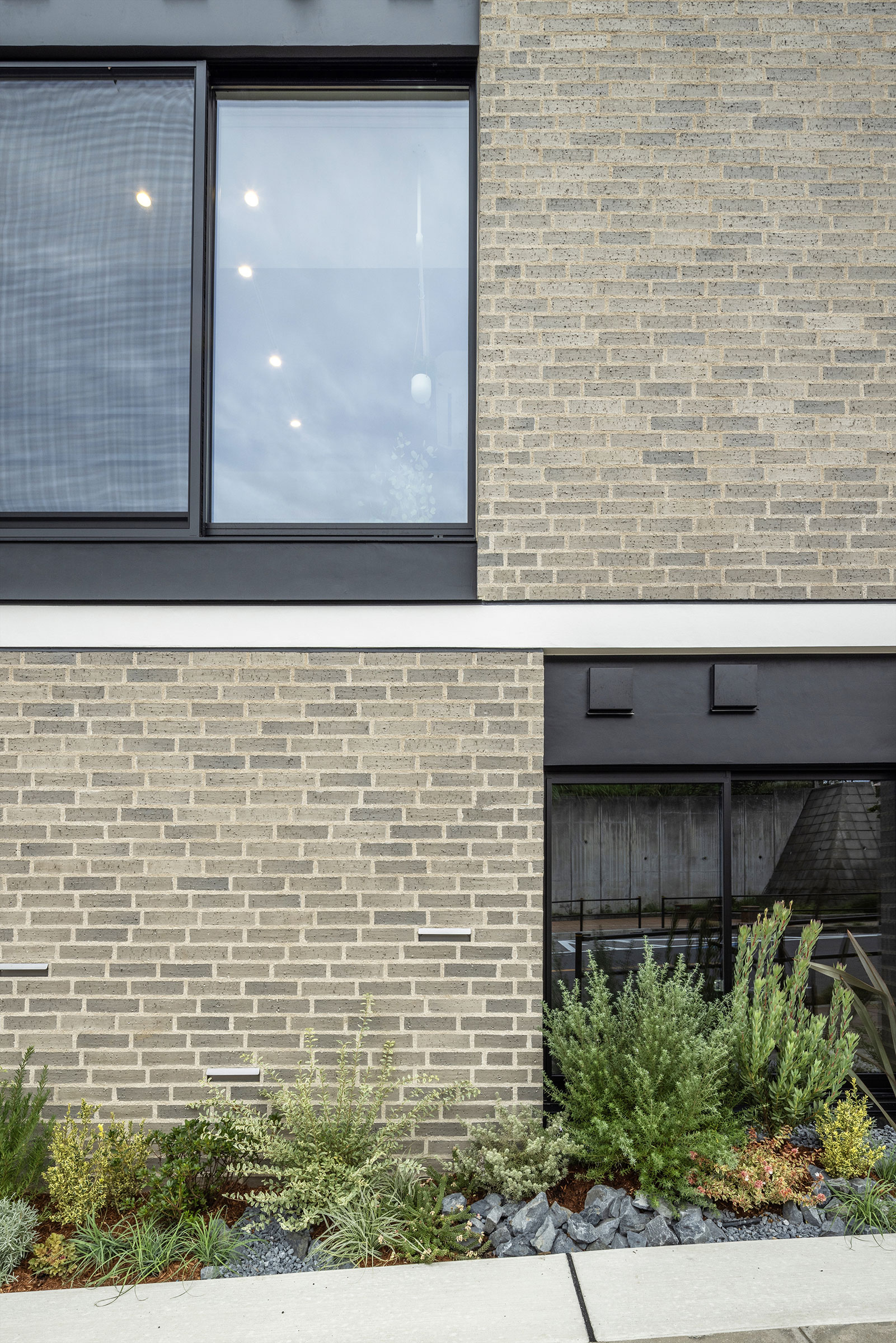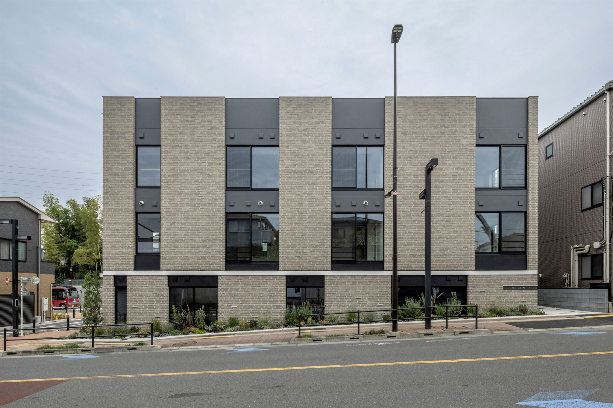 向山博 / 向山建築設計事務所による、東京の「三鷹台ストリート」。駅前のバスターミナルと通りに面した店舗併設の集合住宅。ランドマークであり2つの用途が“協調しあう”在り方を目指し、外周の構造壁を千鳥状にずらして重ねる外観を考案。街への貢献も意図し滞在空間等を設ける外観、西側の外壁の詳細。(建築家による解説:駅に向かう歩行者のために歩道の幅を広げている。店舗の中からも味わえる緑。煉瓦タイルに埋め込まれた足元灯)