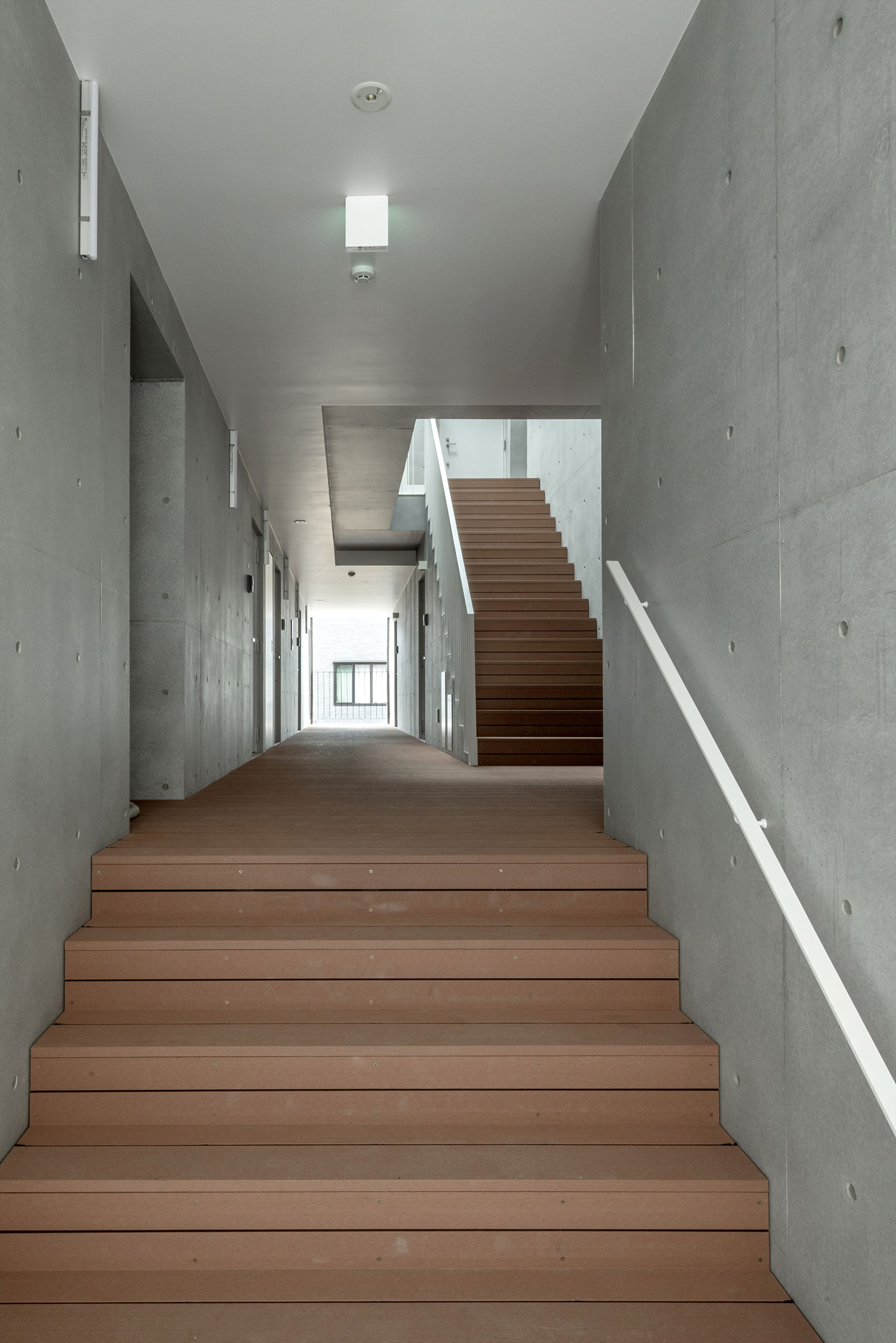 向山博 / 向山建築設計事務所による、東京の「三鷹台ストリート」。駅前のバスターミナルと通りに面した店舗併設の集合住宅。ランドマークであり2つの用途が“協調しあう”在り方を目指し、外周の構造壁を千鳥状にずらして重ねる外観を考案。街への貢献も意図し滞在空間等を設ける2階、共用廊下から3階への階段を見る。(建築家による解説:3階のトップライトから光が注がれる) photo©小出薫