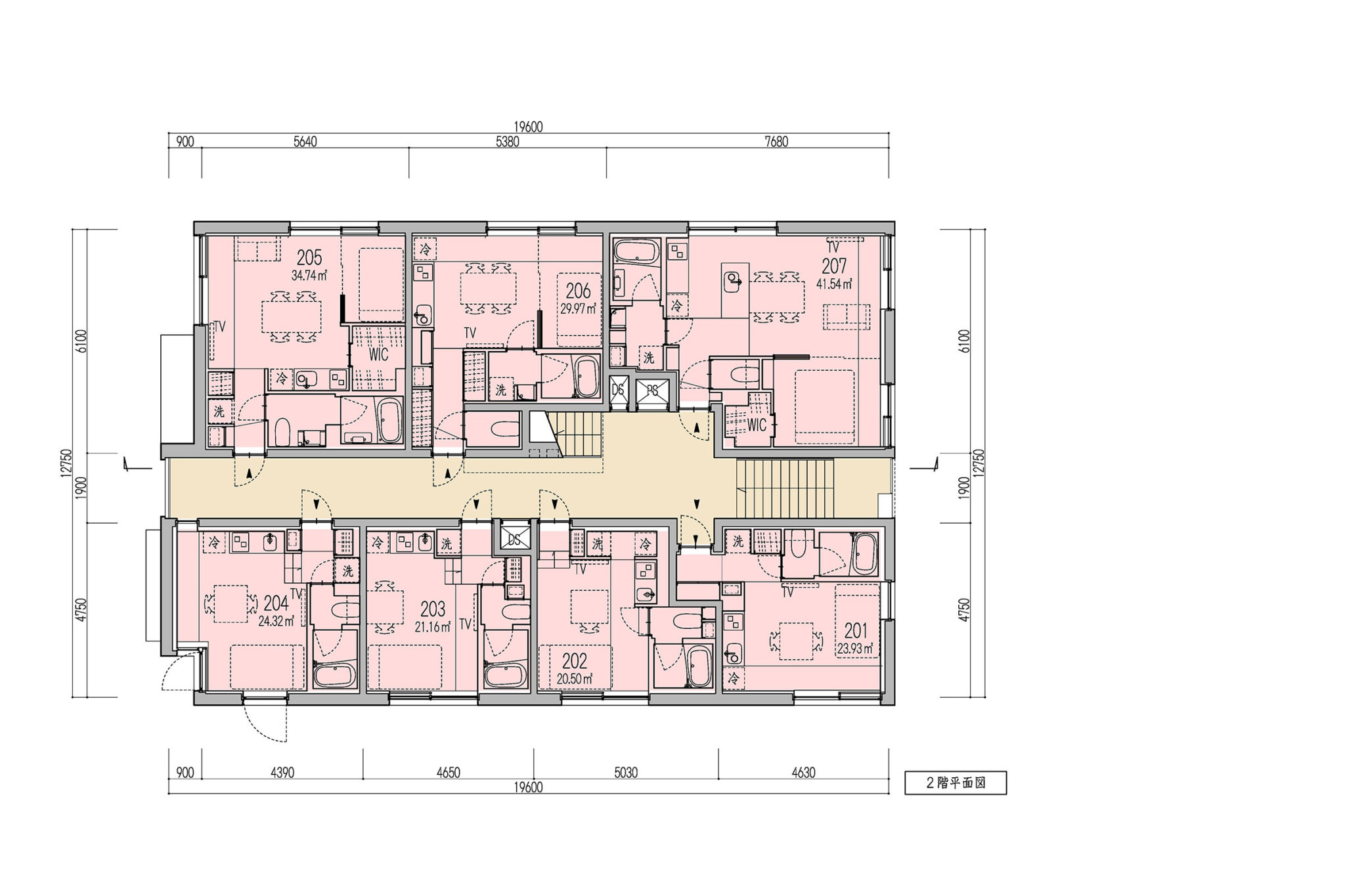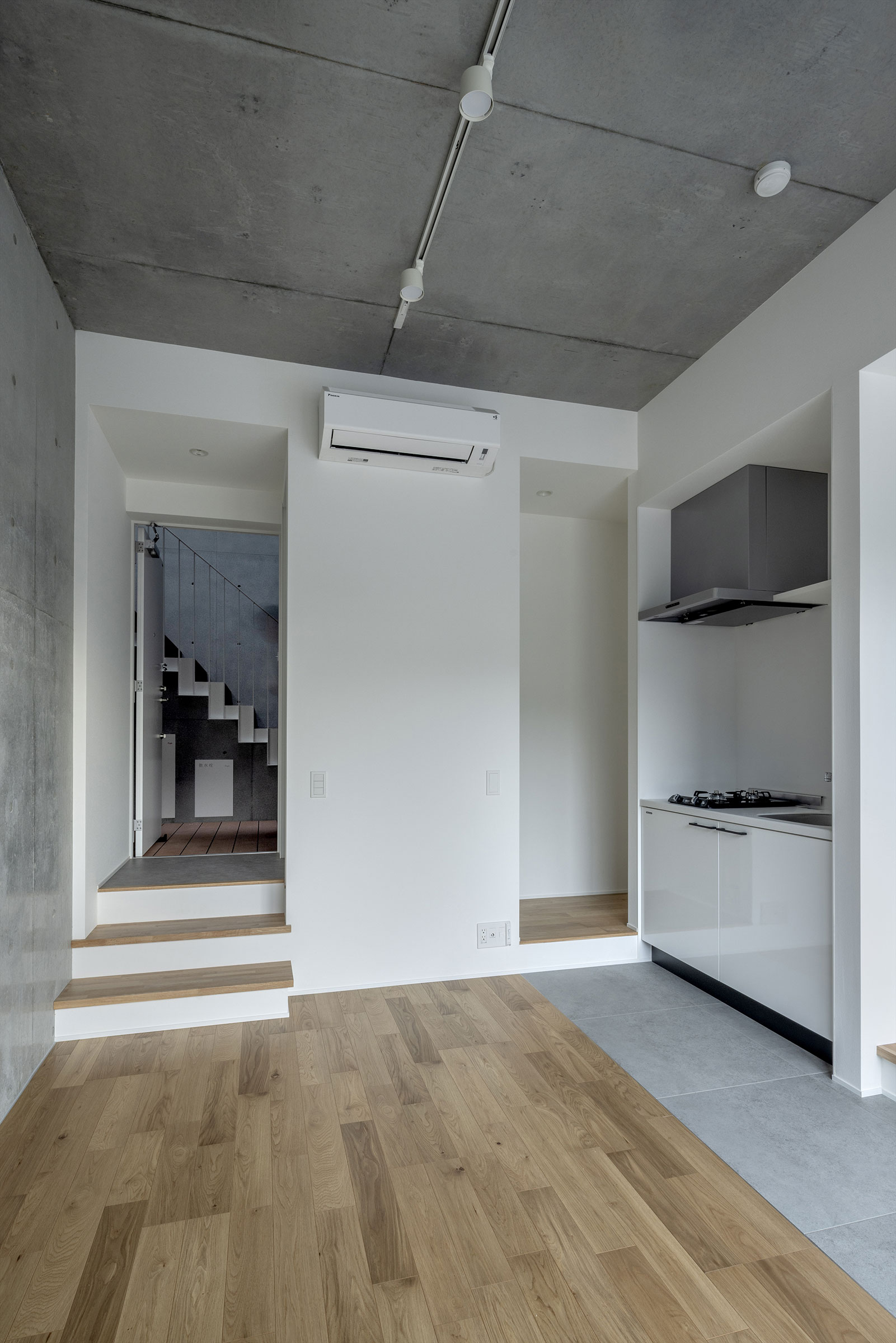 向山博 / 向山建築設計事務所による、東京の「三鷹台ストリート」。駅前のバスターミナルと通りに面した店舗併設の集合住宅。ランドマークであり2つの用途が“協調しあう”在り方を目指し、外周の構造壁を千鳥状にずらして重ねる外観を考案。街への貢献も意図し滞在空間等を設ける2階、住戸202号室(建築家による解説:共用廊下より住戸内が低く、天井高が確保されている) photo©小出薫