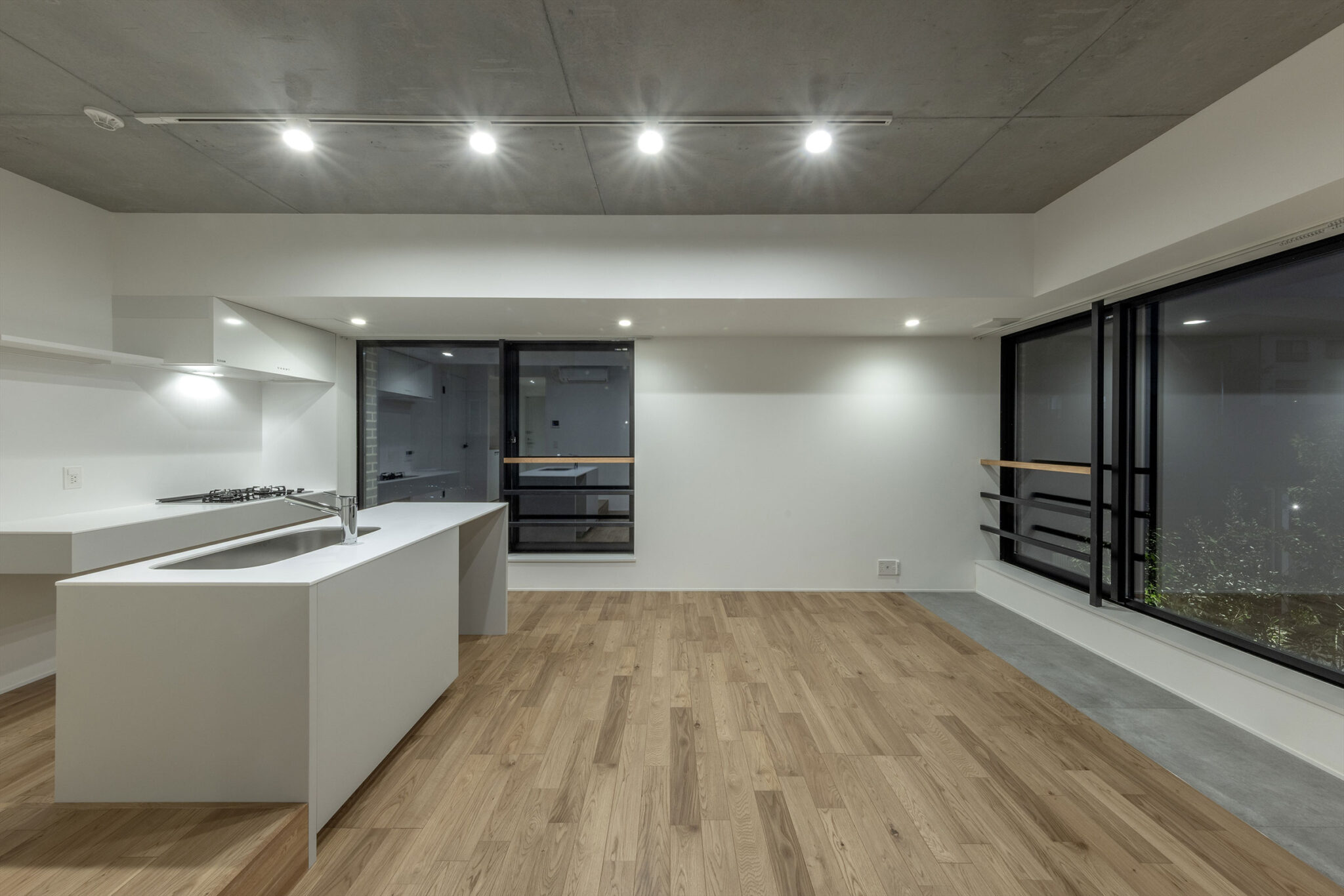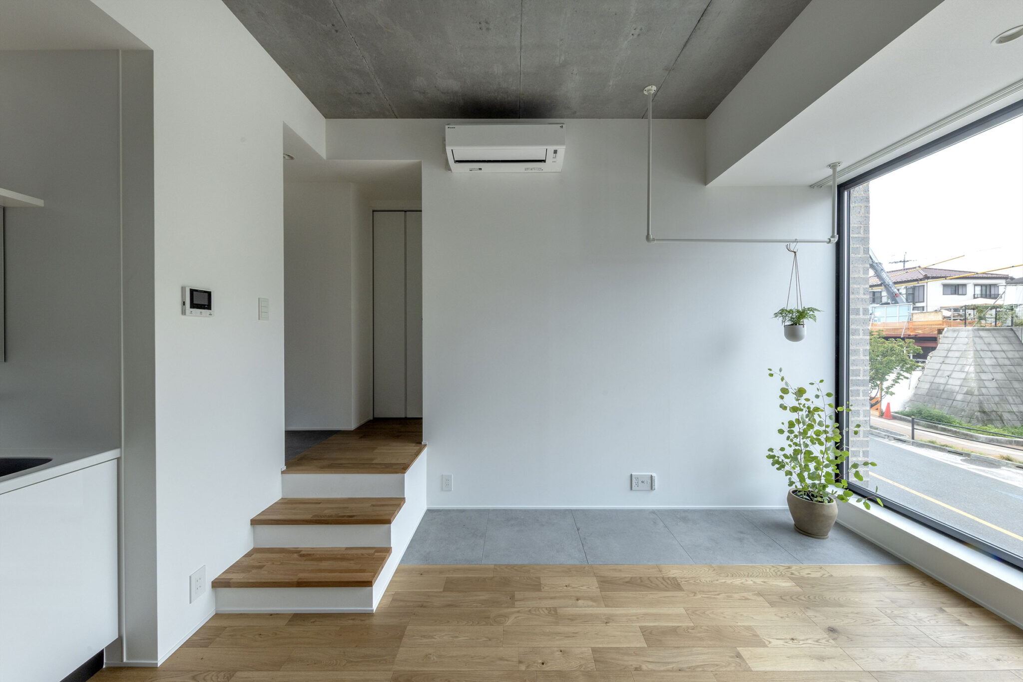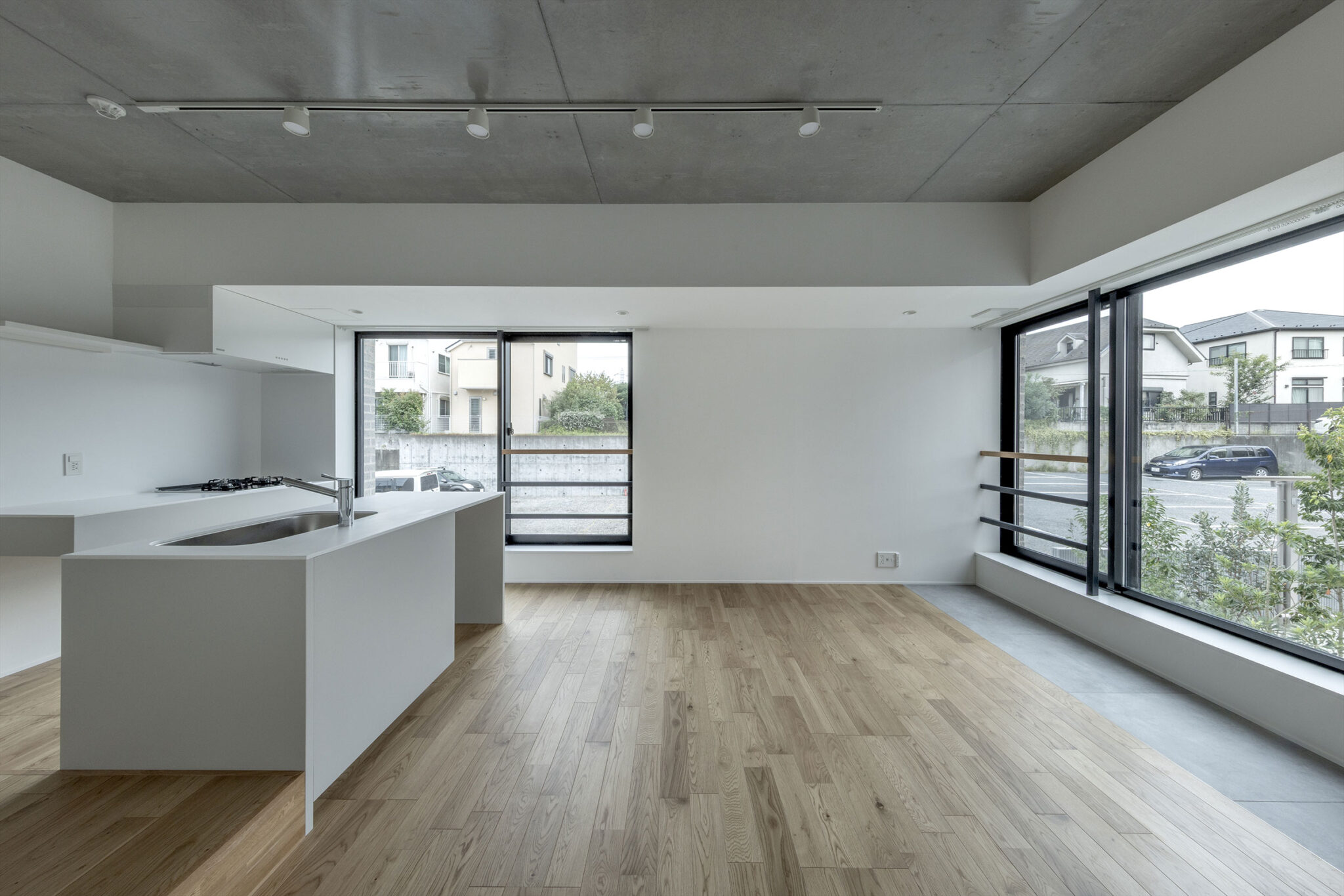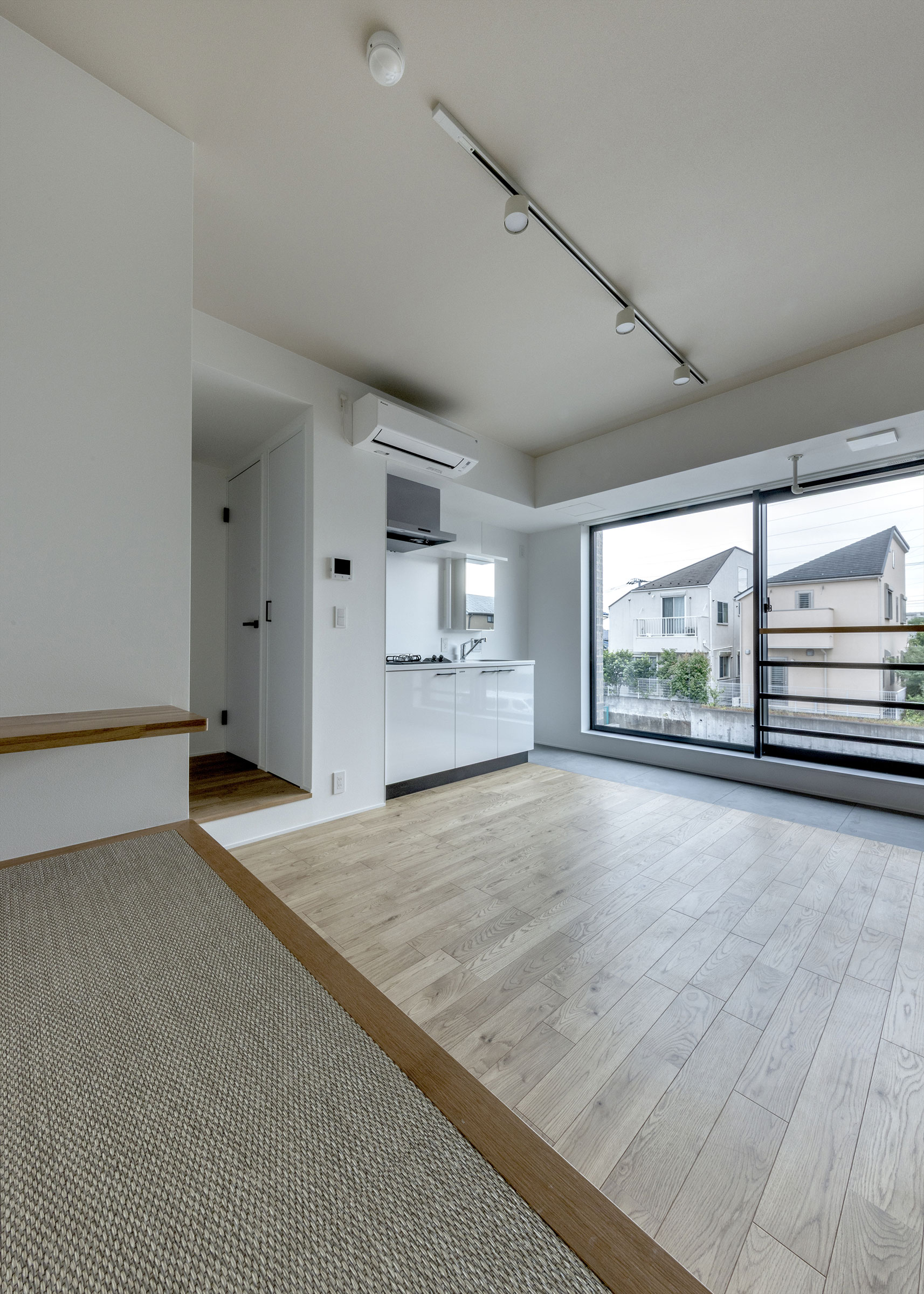 向山博 / 向山建築設計事務所による、東京の「三鷹台ストリート」。駅前のバスターミナルと通りに面した店舗併設の集合住宅。ランドマークであり2つの用途が“協調しあう”在り方を目指し、外周の構造壁を千鳥状にずらして重ねる外観を考案。街への貢献も意図し滞在空間等を設ける2階、住戸203号室(建築家による解説:床が低い分、天井が高い。窓は足元まで開けていて、街とダイレクトに繋がっている) photo©小出薫
