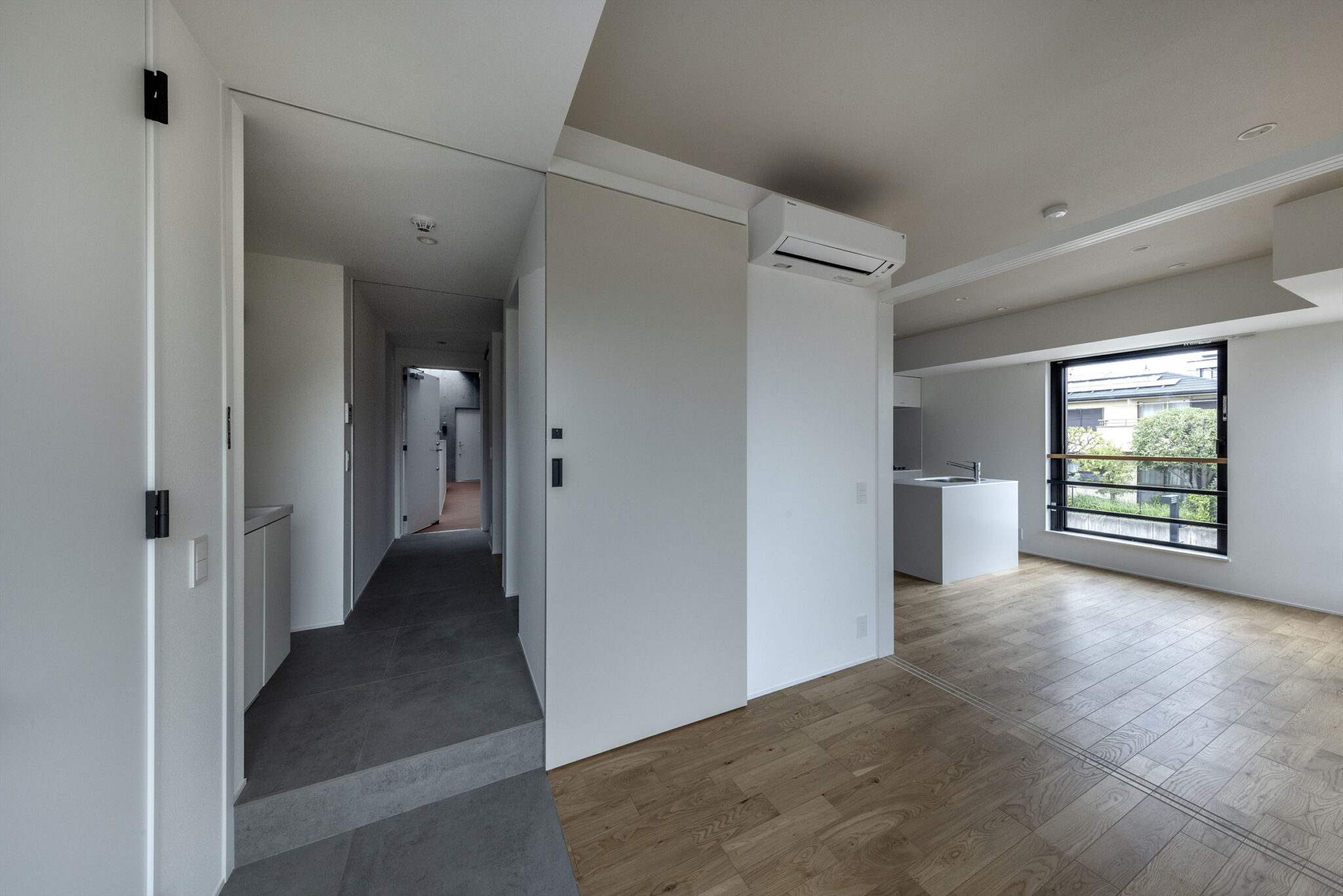 向山博 / 向山建築設計事務所による、東京の「三鷹台ストリート」。駅前のバスターミナルと通りに面した店舗併設の集合住宅。ランドマークであり2つの用途が“協調しあう”在り方を目指し、外周の構造壁を千鳥状にずらして重ねる外観を考案。街への貢献も意図し滞在空間等を設ける3階、住戸304号室(建築家による解説:回遊性のある間取。奥の玄関と手前寝室の間に水回りがある。普段は廊下、玄関側と寝室側の引戸を閉めると脱衣室となる) photo©小出薫