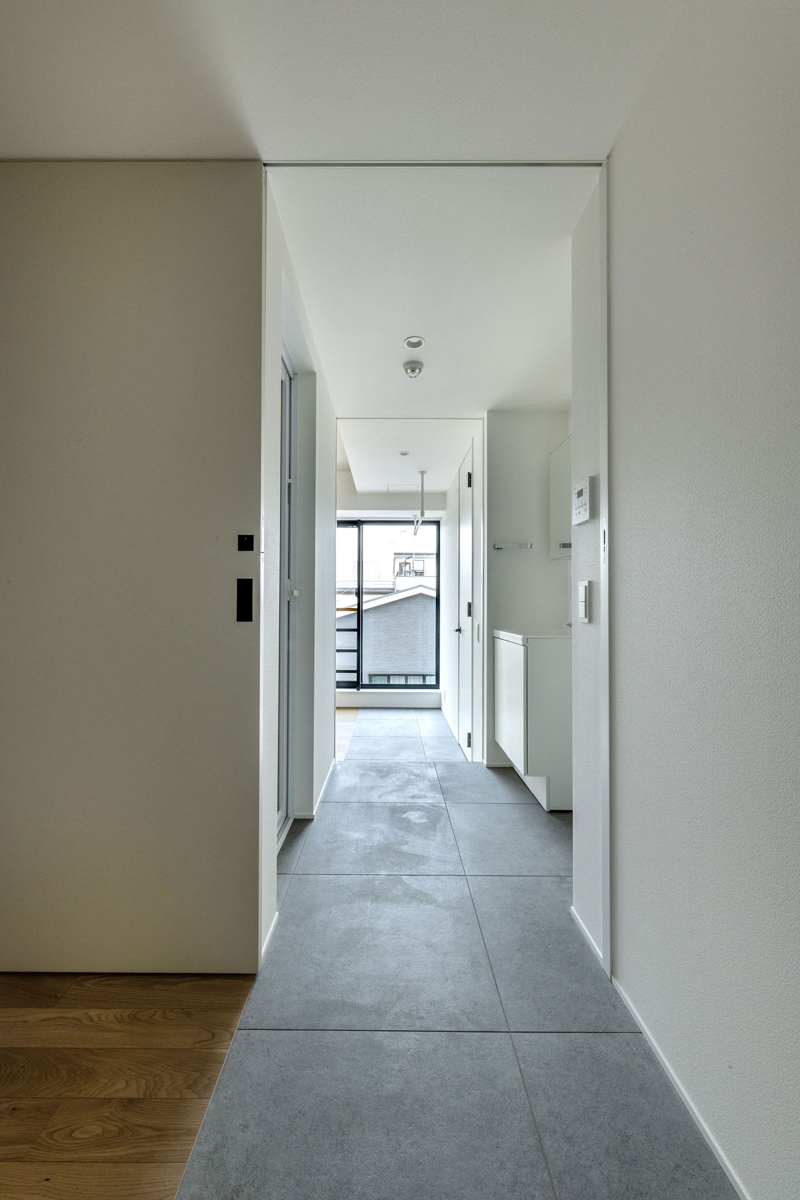 向山博 / 向山建築設計事務所による、東京の「三鷹台ストリート」。駅前のバスターミナルと通りに面した店舗併設の集合住宅。ランドマークであり2つの用途が“協調しあう”在り方を目指し、外周の構造壁を千鳥状にずらして重ねる外観を考案。街への貢献も意図し滞在空間等を設ける3階、住戸304号室(建築家による解説:玄関から脱衣室兼廊下を見る) photo©小出薫