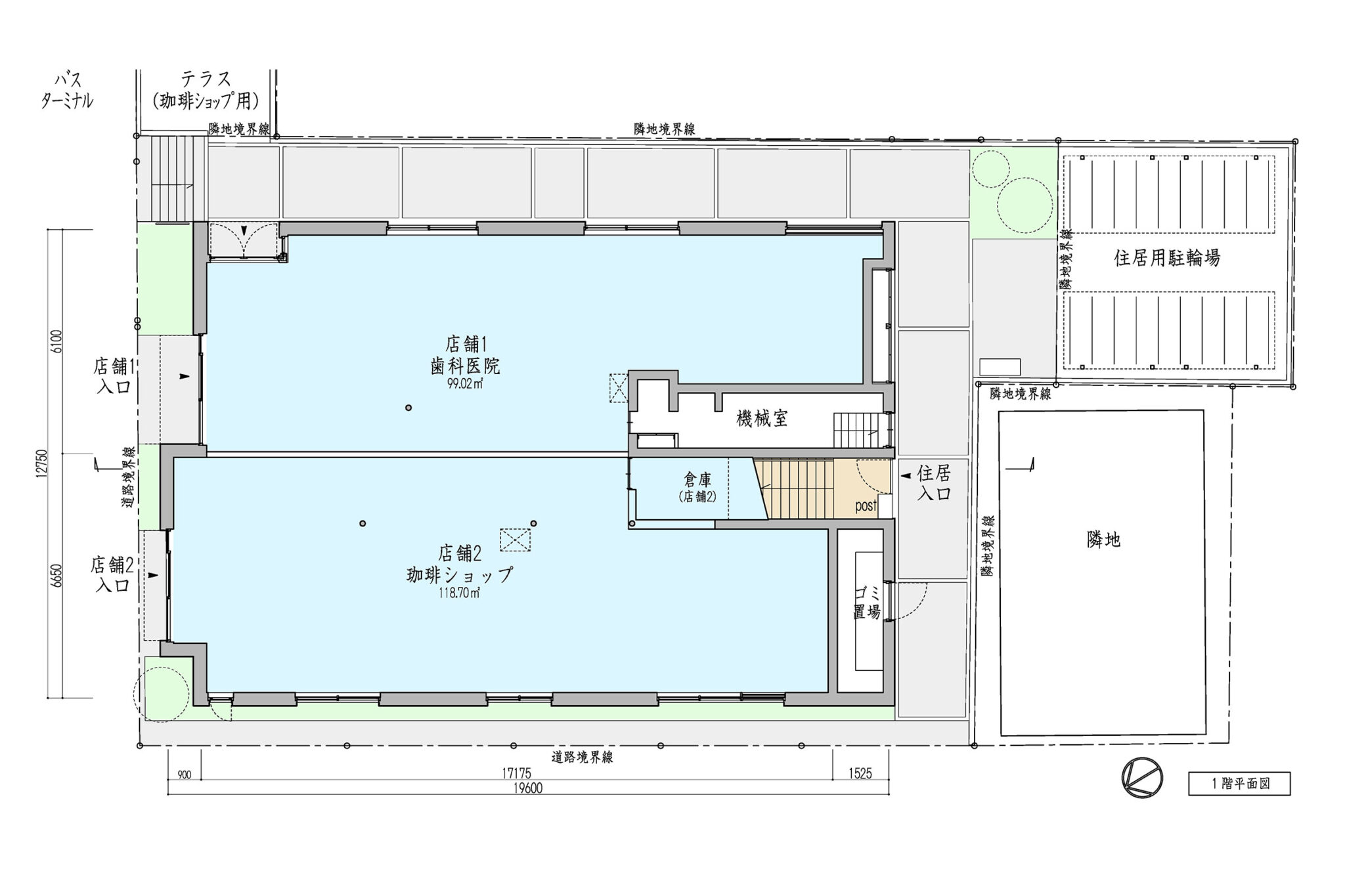 向山博 / 向山建築設計事務所による、東京の「三鷹台ストリート」。駅前のバスターミナルと通りに面した店舗併設の集合住宅。ランドマークであり2つの用途が“協調しあう”在り方を目指し、外周の構造壁を千鳥状にずらして重ねる外観を考案。街への貢献も意図し滞在空間等を設ける1階平面図 image©向山建築設計事務所