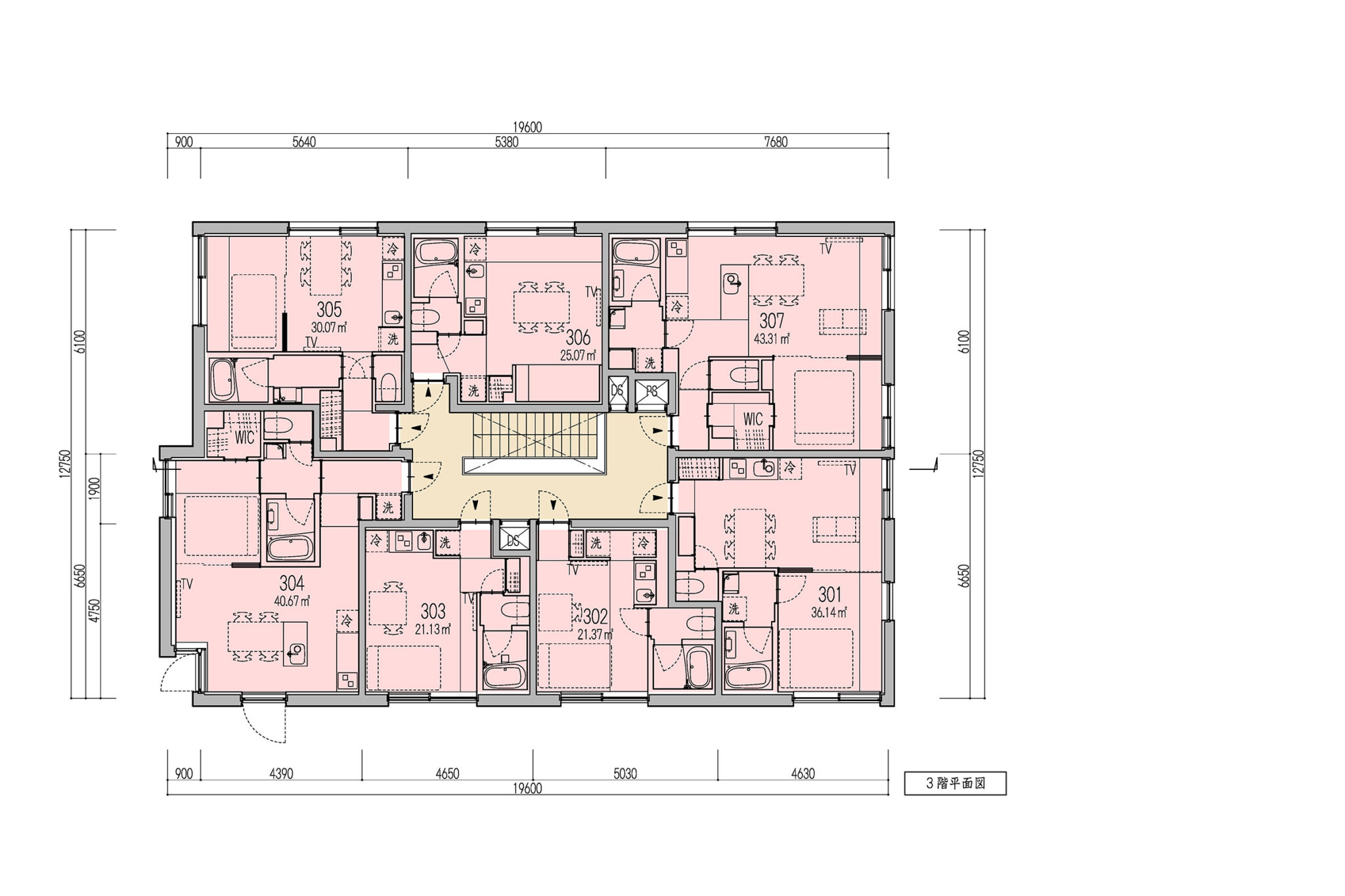 向山博 / 向山建築設計事務所による、東京の「三鷹台ストリート」。駅前のバスターミナルと通りに面した店舗併設の集合住宅。ランドマークであり2つの用途が“協調しあう”在り方を目指し、外周の構造壁を千鳥状にずらして重ねる外観を考案。街への貢献も意図し滞在空間等を設ける3階平面図 image©向山建築設計事務所