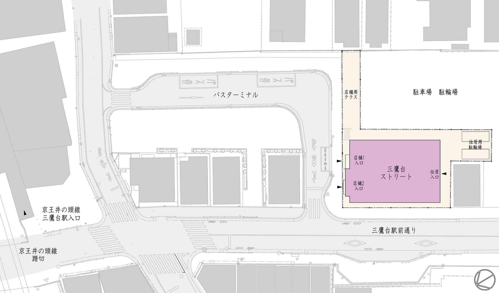 向山博 / 向山建築設計事務所による、東京の「三鷹台ストリート」。駅前のバスターミナルと通りに面した店舗併設の集合住宅。ランドマークであり2つの用途が“協調しあう”在り方を目指し、外周の構造壁を千鳥状にずらして重ねる外観を考案。街への貢献も意図し滞在空間等を設ける配置図 image©向山建築設計事務所