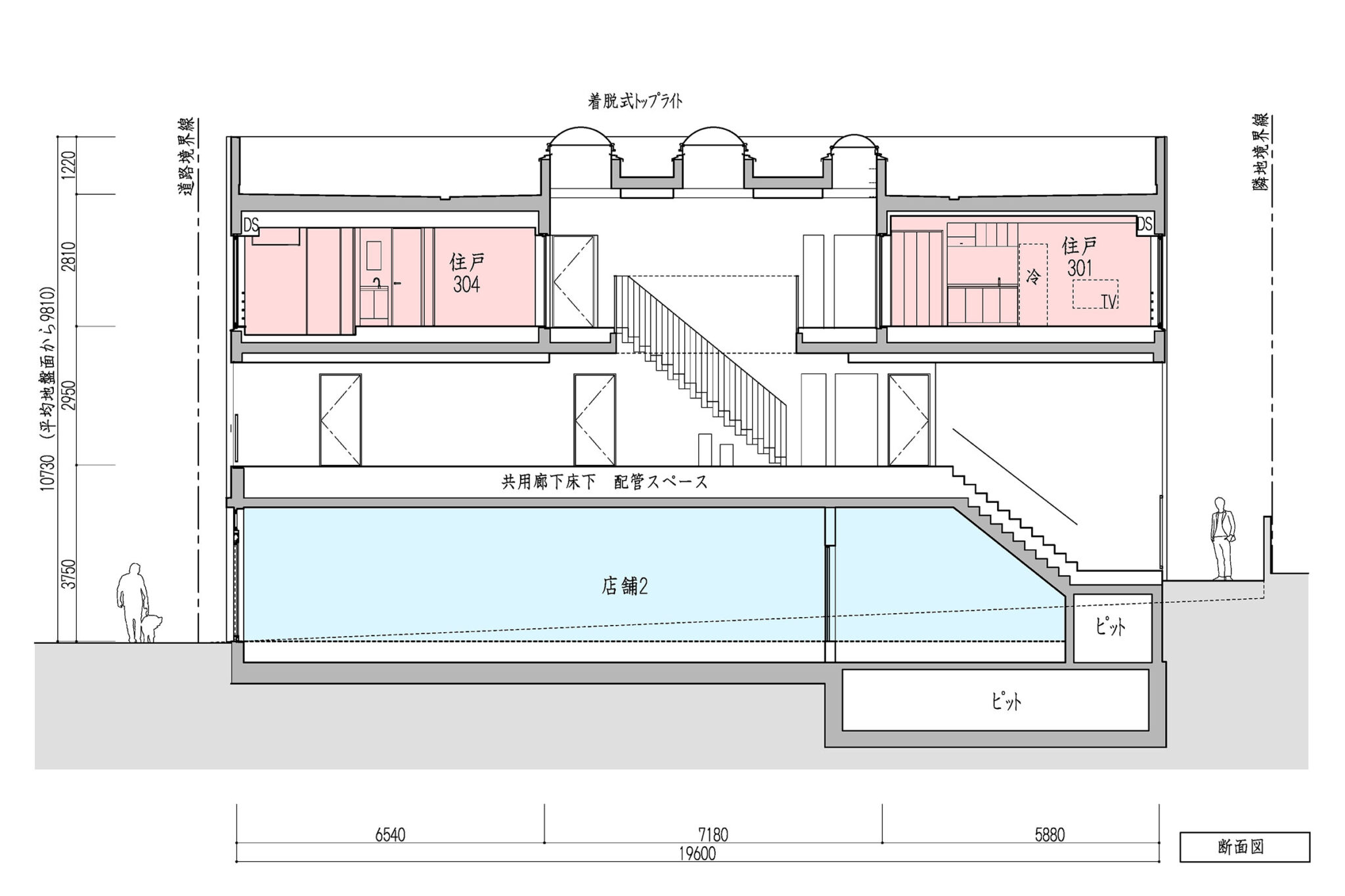 向山博 / 向山建築設計事務所による、東京の「三鷹台ストリート」。駅前のバスターミナルと通りに面した店舗併設の集合住宅。ランドマークであり2つの用途が“協調しあう”在り方を目指し、外周の構造壁を千鳥状にずらして重ねる外観を考案。街への貢献も意図し滞在空間等を設ける断面図 image©向山建築設計事務所