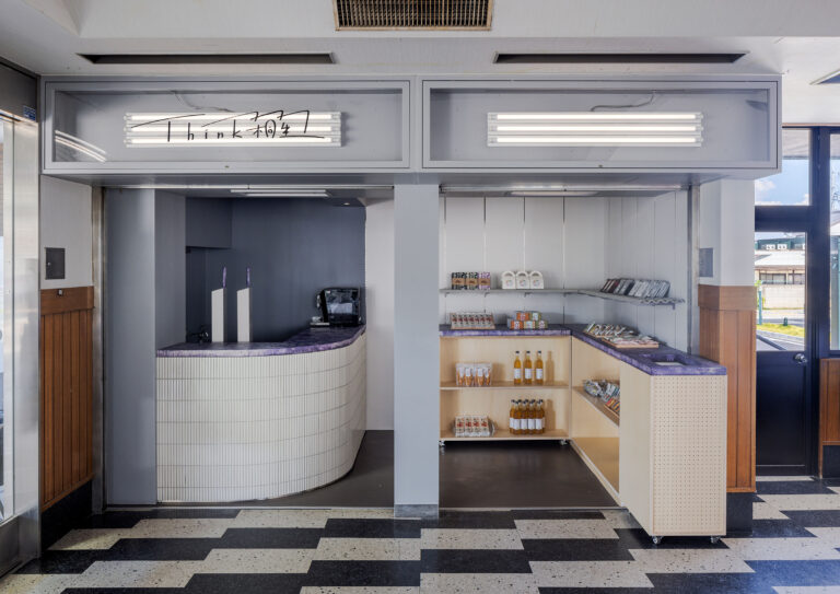 SNARK Inc.による、群馬の店舗「Think桐生」。駅構内のビアスタンド併設の売店。“地域活性化の新たな拠点”を目指し、エリアを想起させる素材を用いて文化や風景の“アイコン化”を実施。時間帯での利用客の変化に応える為にカウンターとなる可動什器も考案サイン photo©新澤一平
