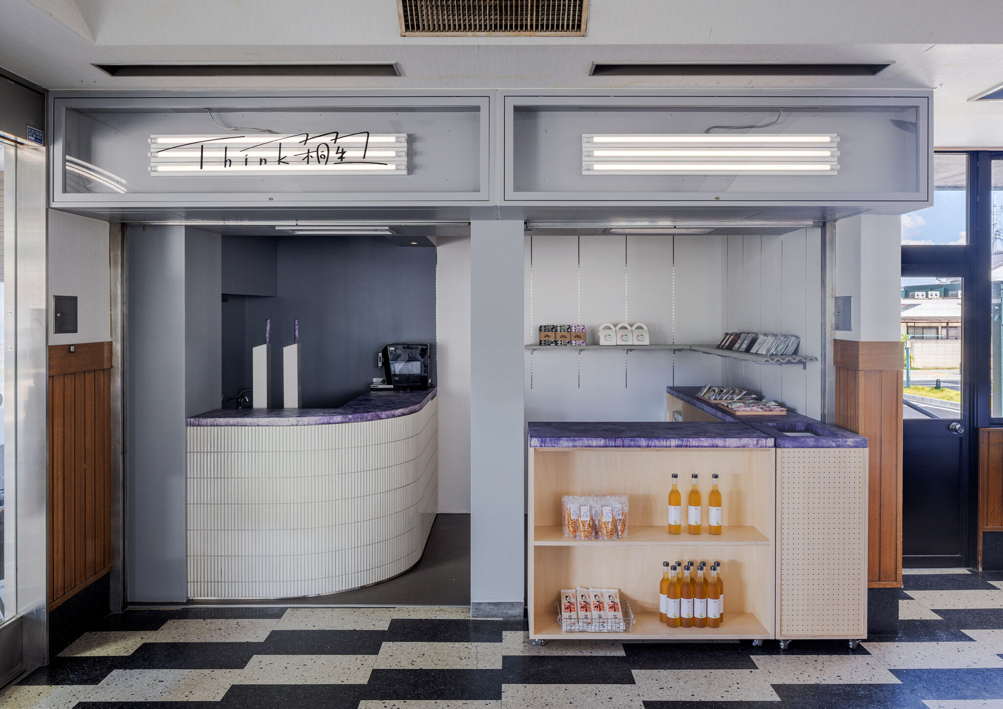 SNARK Inc.による、群馬の店舗「Think桐生」。駅構内のビアスタンド併設の売店。“地域活性化の新たな拠点”を目指し、エリアを想起させる素材を用いて文化や風景の“アイコン化”を実施。時間帯での利用客の変化に応える為にカウンターとなる可動什器も考案駅待合所から見る。(稼動什器を表に出した状態) photo©新澤一平