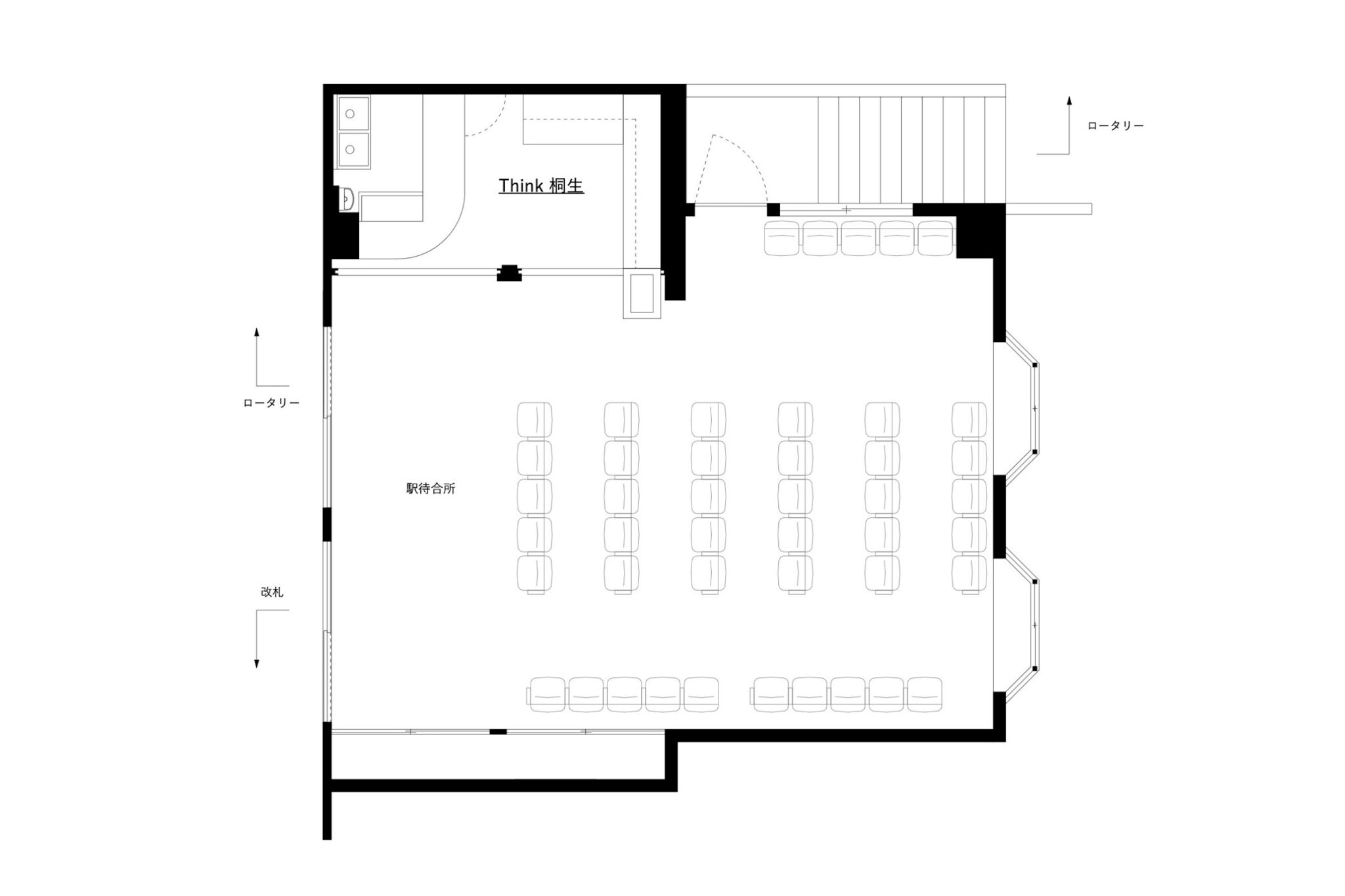 SNARK Inc.による、群馬の店舗「Think桐生」。駅構内のビアスタンド併設の売店。“地域活性化の新たな拠点”を目指し、エリアを想起させる素材を用いて文化や風景の“アイコン化”を実施。時間帯での利用客の変化に応える為にカウンターとなる可動什器も考案平面図(駅待合所を含む) image©SNARK Inc.