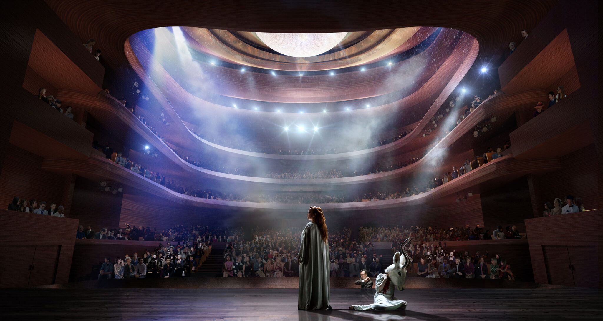 At the heart of the building, the opera hall is designed as a finely tuned musical instrument. Its form is meticulously engineered to support world-class operatic acoustics, with solid cherry wood panels shaping the interior and enhancing resonance, warmth, and sonic clarity.