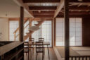 一色暁生建築設計事務所による、大阪・吹田市の「佐井寺の家」。標準像としての“ニュートラルな日本の住まい”も目指した計画。伸びやかな暮らしを求め、内外が完全に隔てられていない“透け感をもつ”建築を志向。日本家屋の意匠を“現代的に解釈”した要素でつくり上げる1階、キッチン側から食事室越しに2階への階段を見る。 photo©Benjamin Hosking