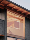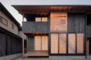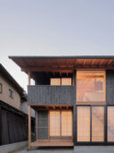 一色暁生建築設計事務所による、大阪・吹田市の「佐井寺の家」。標準像としての“ニュートラルな日本の住まい”も目指した計画。伸びやかな暮らしを求め、内外が完全に隔てられていない“透け感をもつ”建築を志向。日本家屋の意匠を“現代的に解釈”した要素でつくり上げる外観、2階の開口部越しに内部を見る。夕景 photo©Benjamin Hosking
