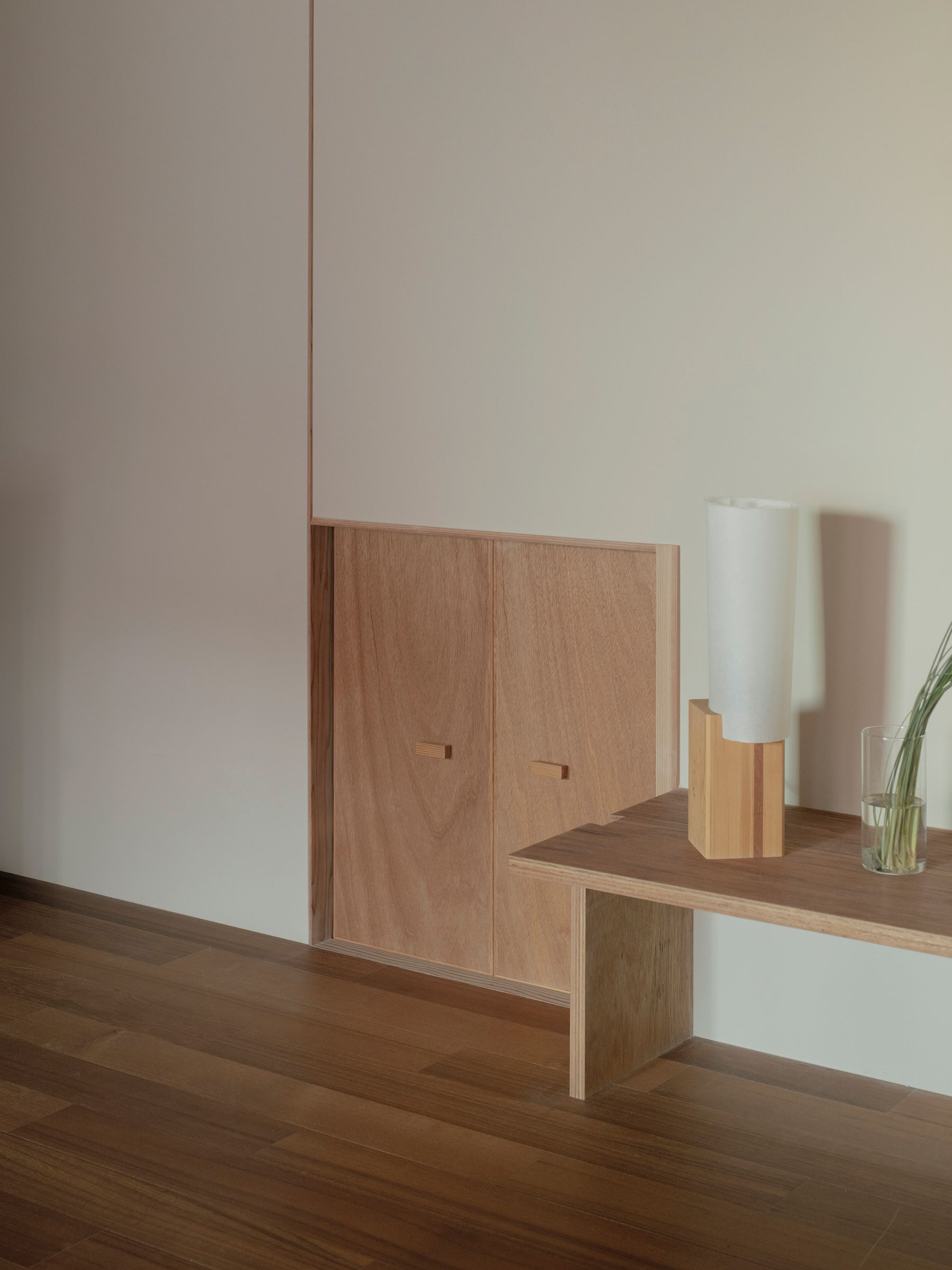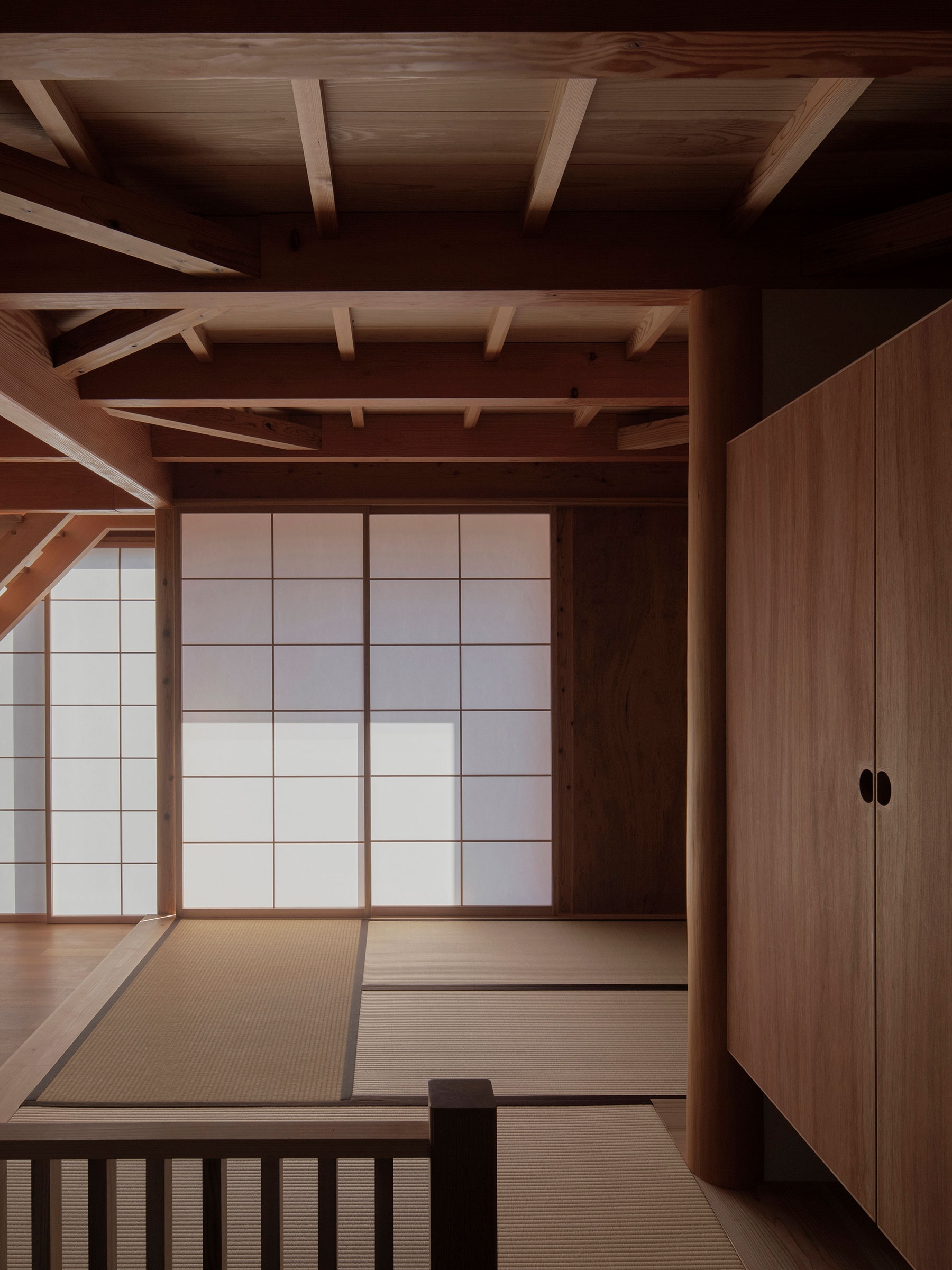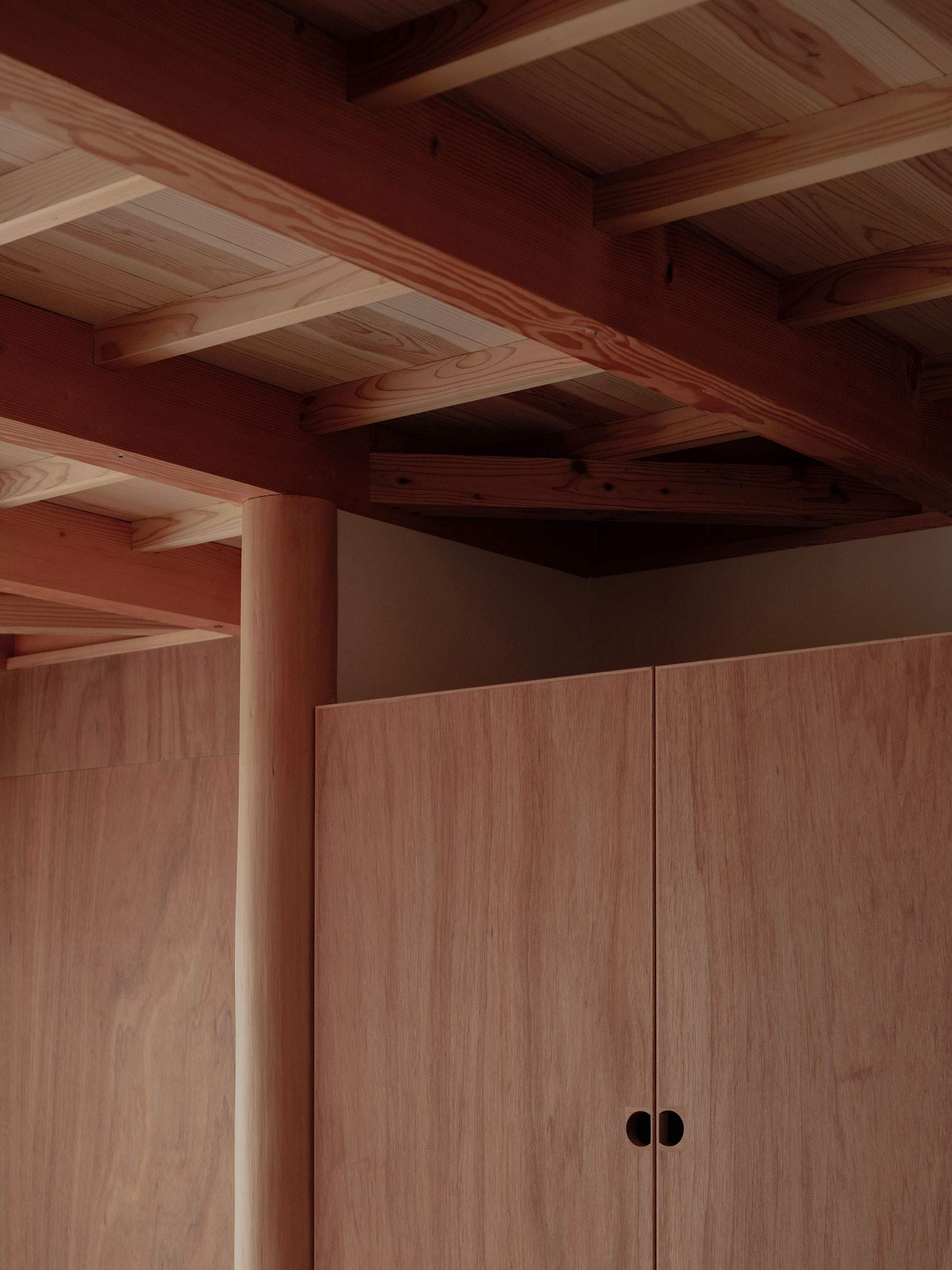 一色暁生建築設計事務所による、大阪・吹田市の「佐井寺の家」。標準像としての“ニュートラルな日本の住まい”も目指した計画。伸びやかな暮らしを求め、内外が完全に隔てられていない“透け感をもつ”建築を志向。日本家屋の意匠を“現代的に解釈”した要素でつくり上げる1階、天井・柱・押入の詳細 photo©Benjamin Hosking