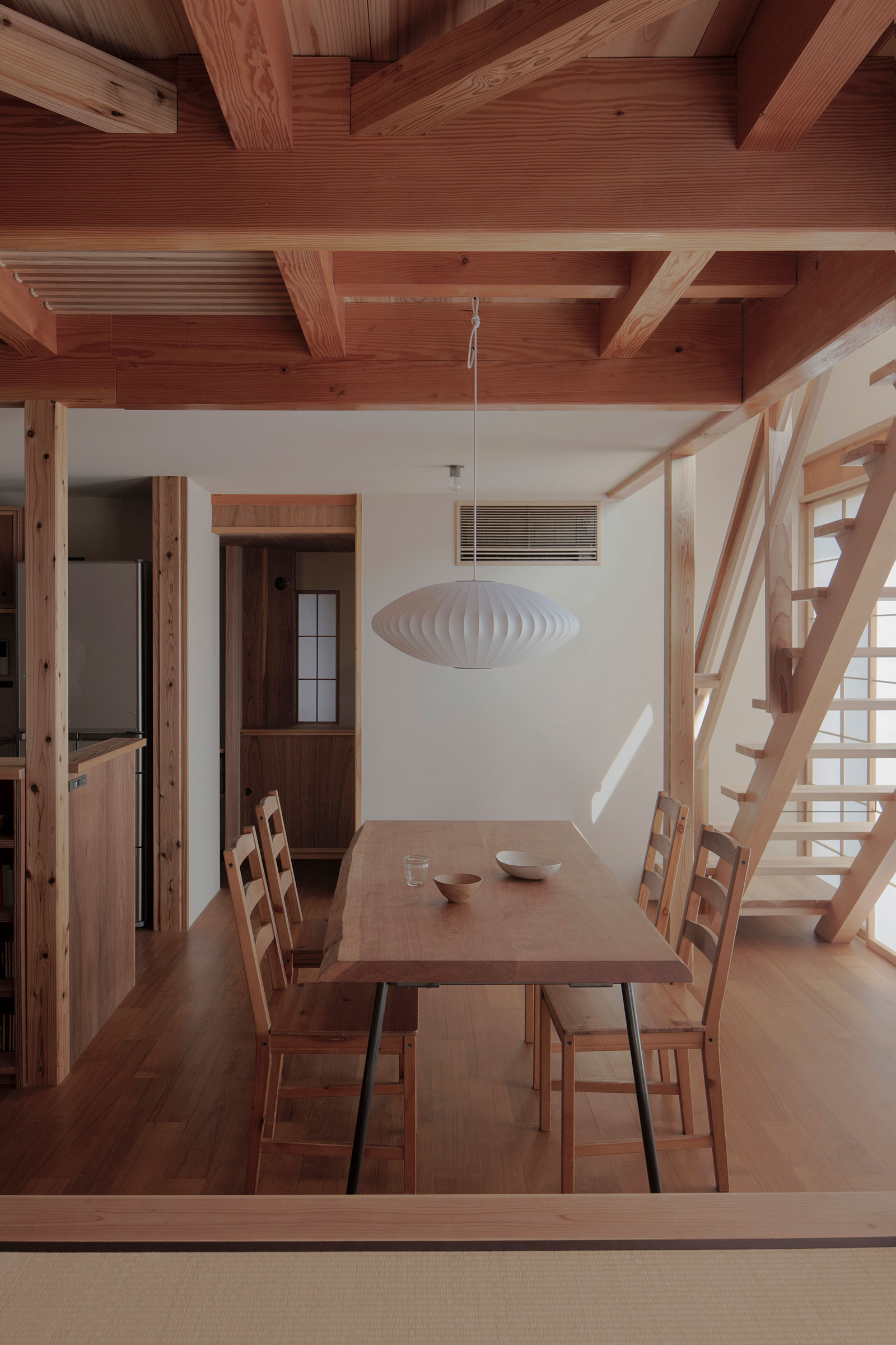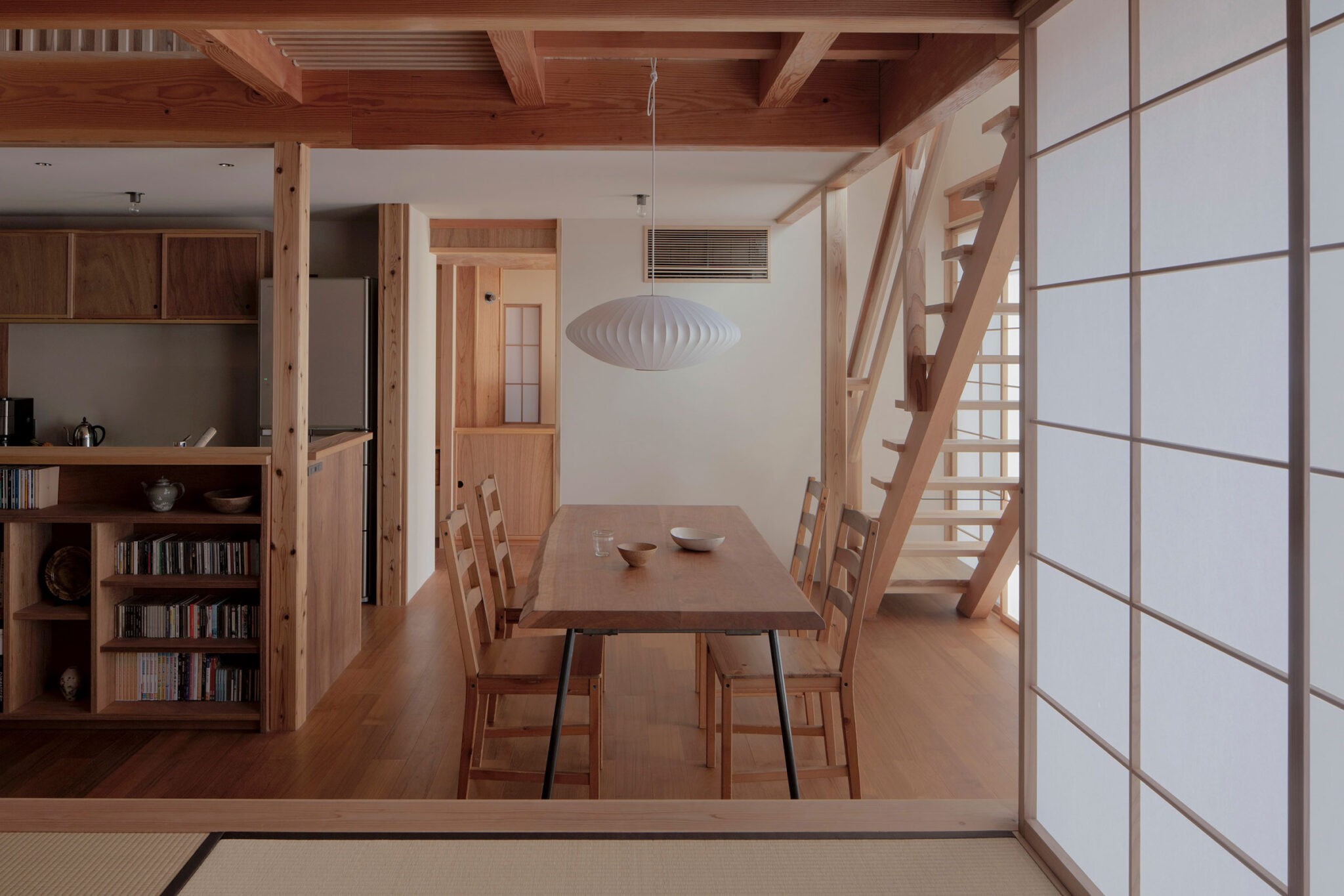 一色暁生建築設計事務所による、大阪・吹田市の「佐井寺の家」。標準像としての“ニュートラルな日本の住まい”も目指した計画。伸びやかな暮らしを求め、内外が完全に隔てられていない“透け感をもつ”建築を志向。日本家屋の意匠を“現代的に解釈”した要素でつくり上げる1階、キッチン側から食事室越しに2階への階段を見る。 photo©Benjamin Hosking