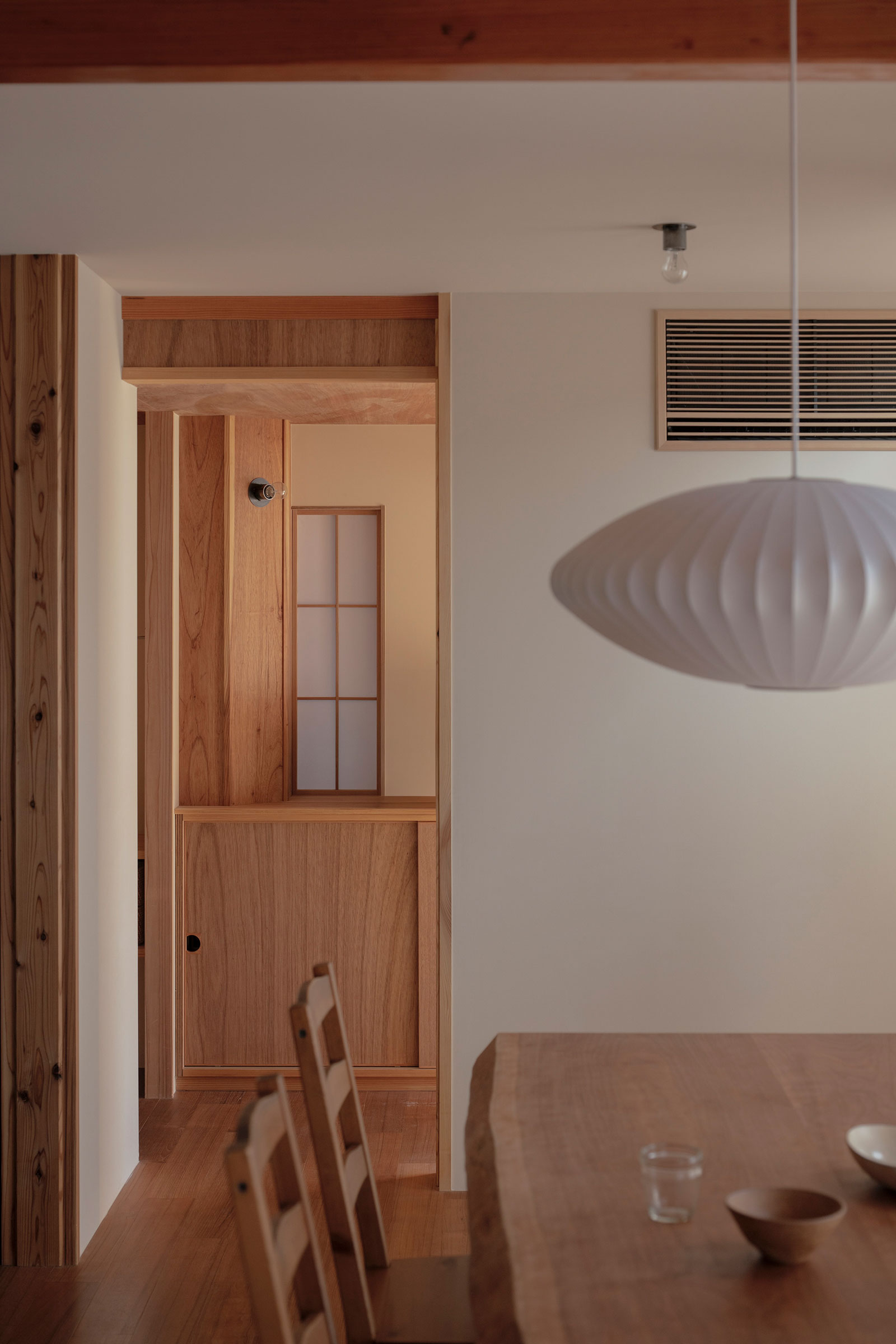 一色暁生建築設計事務所による、大阪・吹田市の「佐井寺の家」。標準像としての“ニュートラルな日本の住まい”も目指した計画。伸びやかな暮らしを求め、内外が完全に隔てられていない“透け感をもつ”建築を志向。日本家屋の意匠を“現代的に解釈”した要素でつくり上げる1階、食事室から洗面所側を見る。 photo©Benjamin Hosking