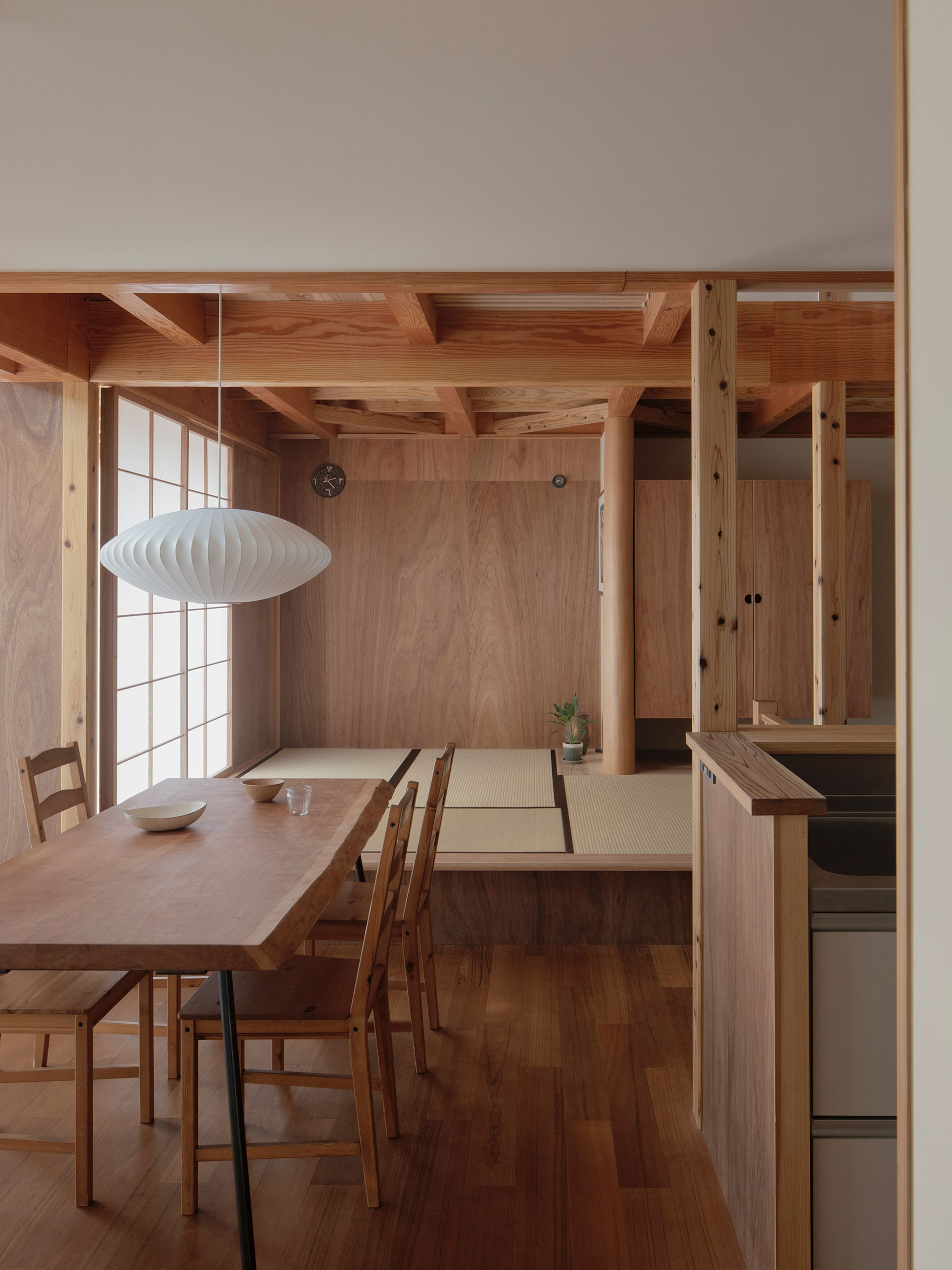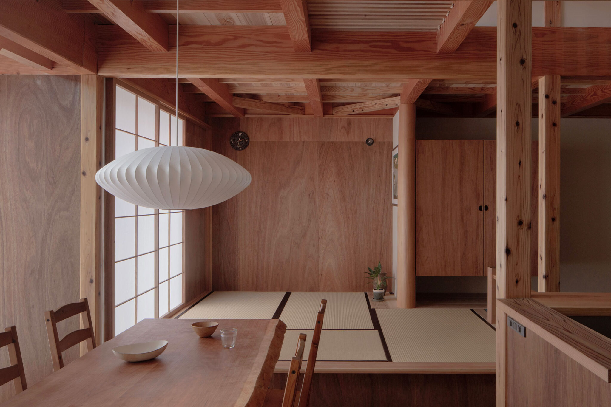 一色暁生建築設計事務所による、大阪・吹田市の「佐井寺の家」。標準像としての“ニュートラルな日本の住まい”も目指した計画。伸びやかな暮らしを求め、内外が完全に隔てられていない“透け感をもつ”建築を志向。日本家屋の意匠を“現代的に解釈”した要素でつくり上げる1階、和室から食事室を見る。 photo©Benjamin Hosking