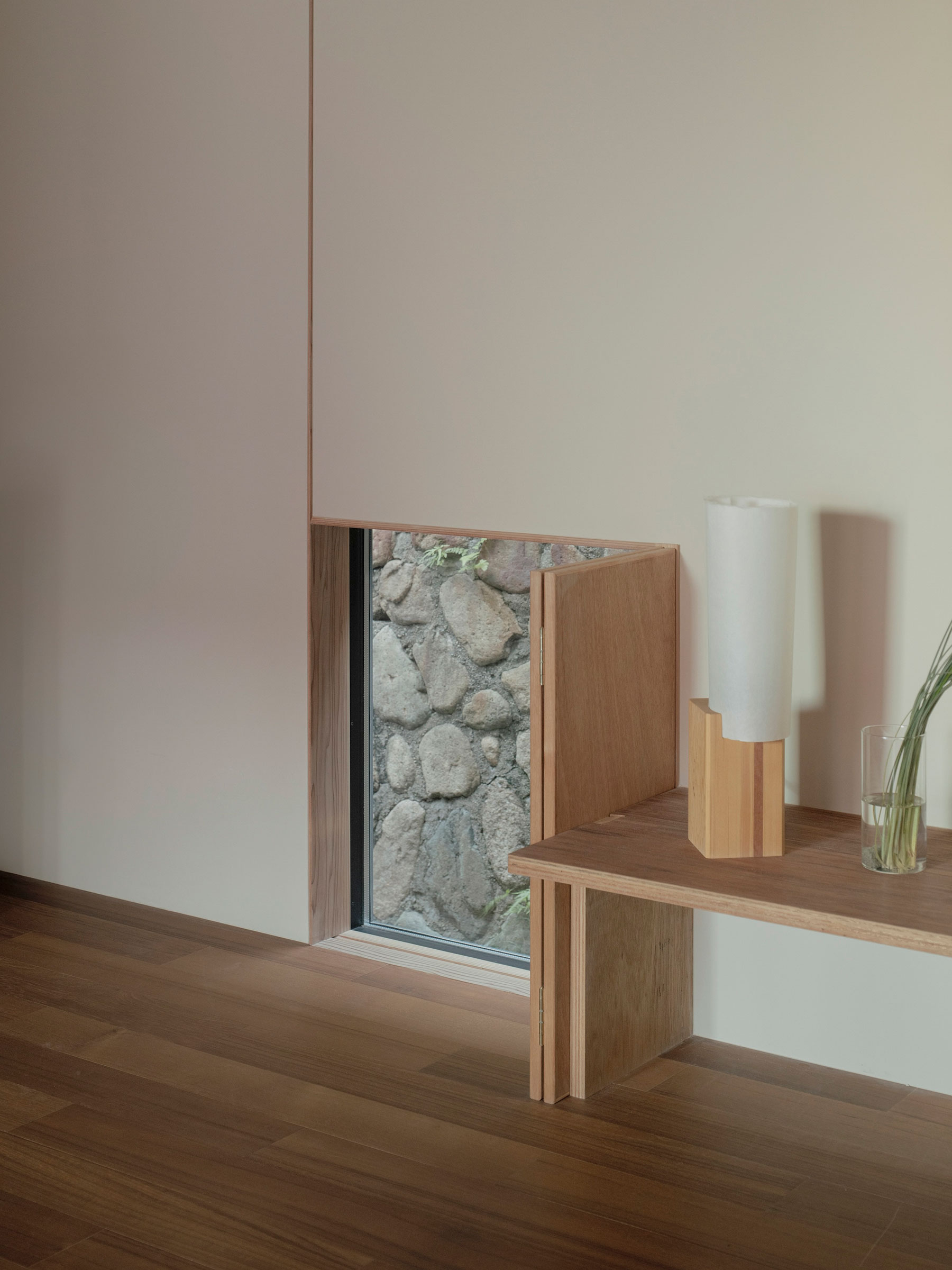地窓を塞ぐ板戸は、折り畳んで持ち手を天板の切り欠きに噛み合わせることで、テレビ台と一体造作のように収納できる。これは、日本建築に見られる、使うときだけ機能が立ち現れ、不要なときには空間や家具の一部として溶け込む可動性・兼用性から着想を得て考案したものだ。