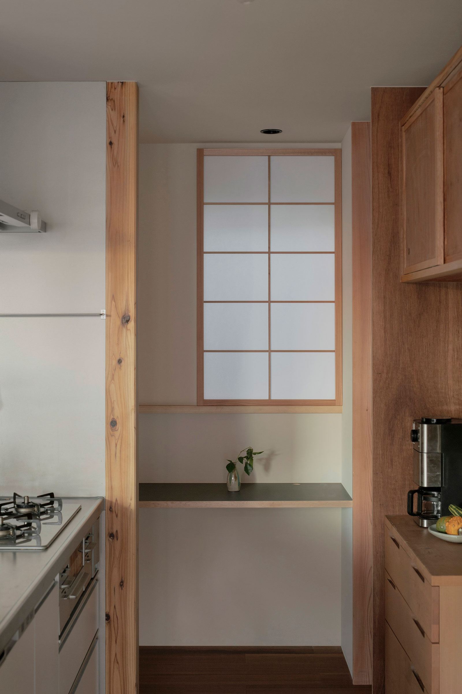 一色暁生建築設計事務所による、大阪・吹田市の「佐井寺の家」。標準像としての“ニュートラルな日本の住まい”も目指した計画。伸びやかな暮らしを求め、内外が完全に隔てられていない“透け感をもつ”建築を志向。日本家屋の意匠を“現代的に解釈”した要素でつくり上げる1階、食事室側からキッチンを見る。 photo©Benjamin Hosking