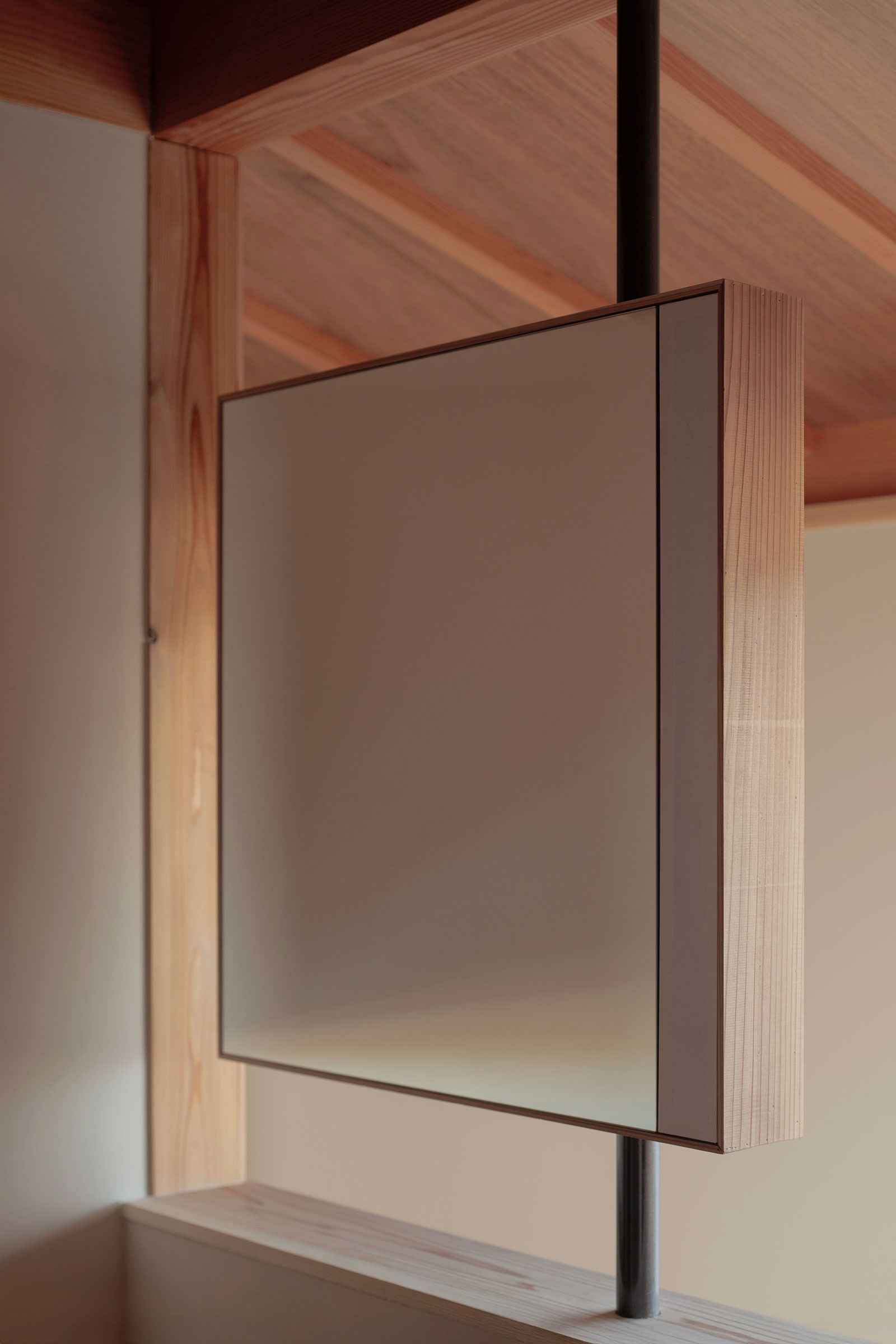 さらに、和室の障子では戸先に目隠し用の堅木を取り付けることで柱に絡む縦枠を省き、2階の引戸では柱梁そのものに鴨居や枠の役目を担わせ、枠を一部排除している。こうした操作により、軸組の独立性を際立たせ、真壁に通じる骨格の明快さを引き出している。