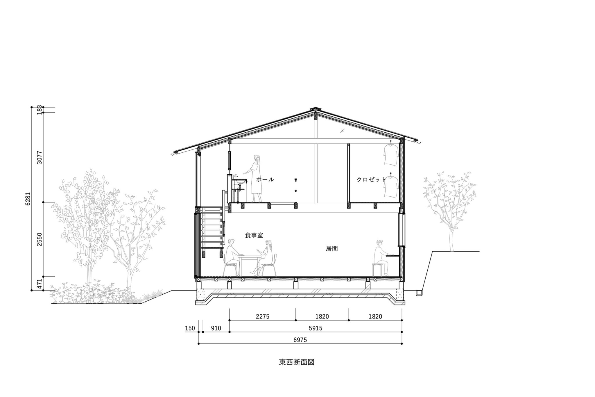 一色暁生建築設計事務所による、大阪・吹田市の「佐井寺の家」。標準像としての“ニュートラルな日本の住まい”も目指した計画。伸びやかな暮らしを求め、内外が完全に隔てられていない“透け感をもつ”建築を志向。日本家屋の意匠を“現代的に解釈”した要素でつくり上げる東西断面図 image©一色暁生建築設計事務所