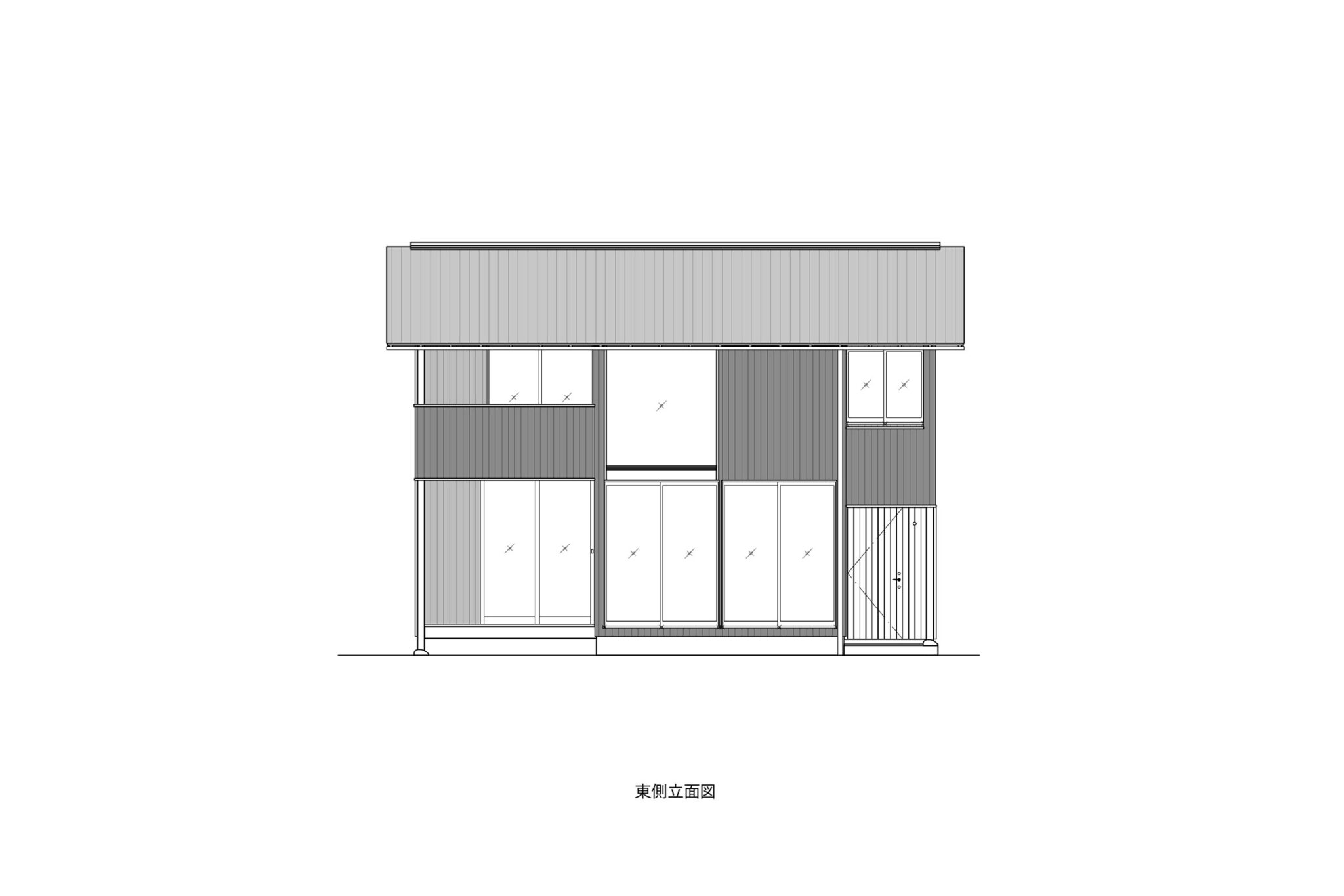 一色暁生建築設計事務所による、大阪・吹田市の「佐井寺の家」。標準像としての“ニュートラルな日本の住まい”も目指した計画。伸びやかな暮らしを求め、内外が完全に隔てられていない“透け感をもつ”建築を志向。日本家屋の意匠を“現代的に解釈”した要素でつくり上げる東側立面図 image©一色暁生建築設計事務所