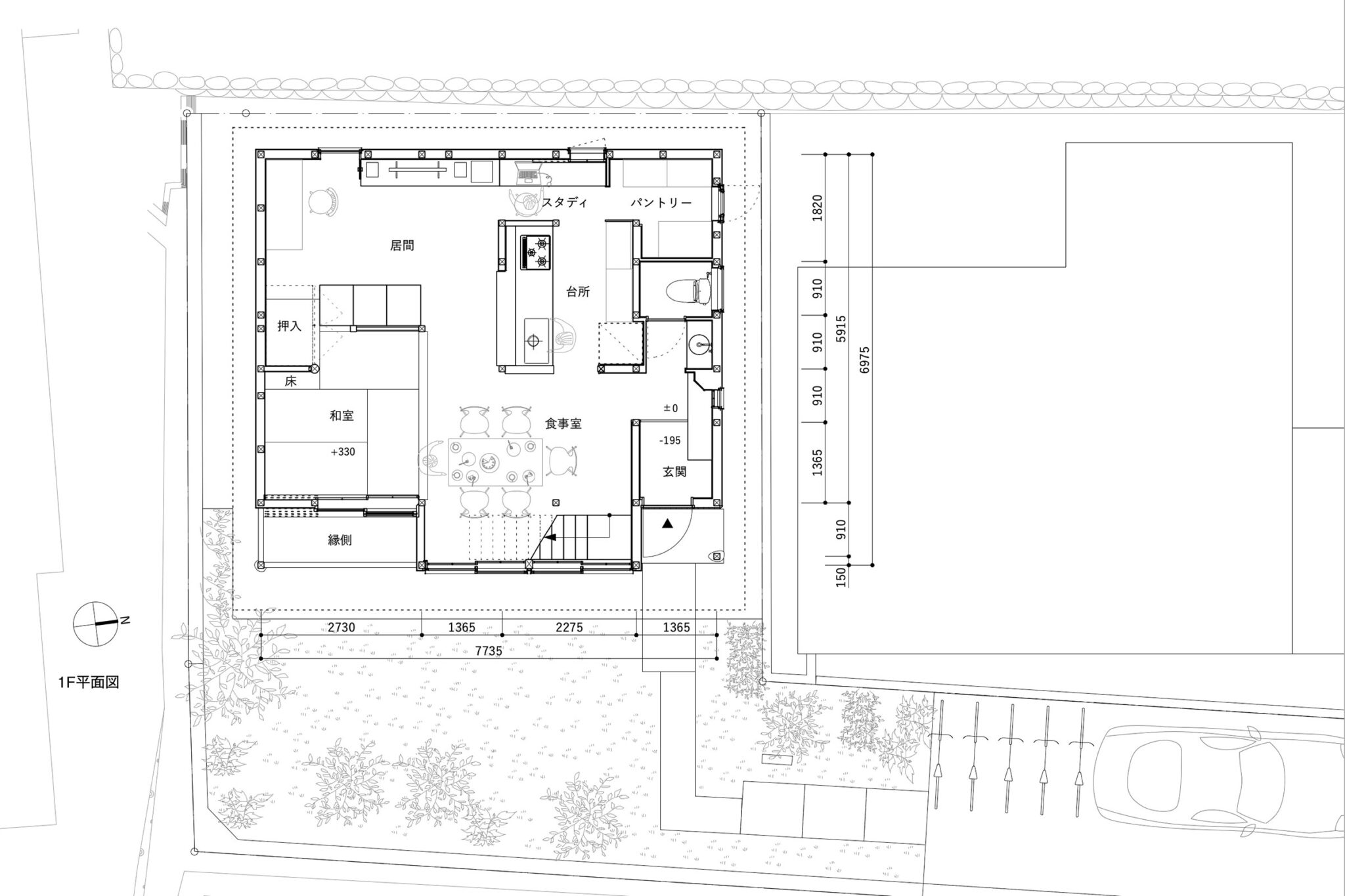 一色暁生建築設計事務所による、大阪・吹田市の「佐井寺の家」。標準像としての“ニュートラルな日本の住まい”も目指した計画。伸びやかな暮らしを求め、内外が完全に隔てられていない“透け感をもつ”建築を志向。日本家屋の意匠を“現代的に解釈”した要素でつくり上げる1階平面図 image©一色暁生建築設計事務所