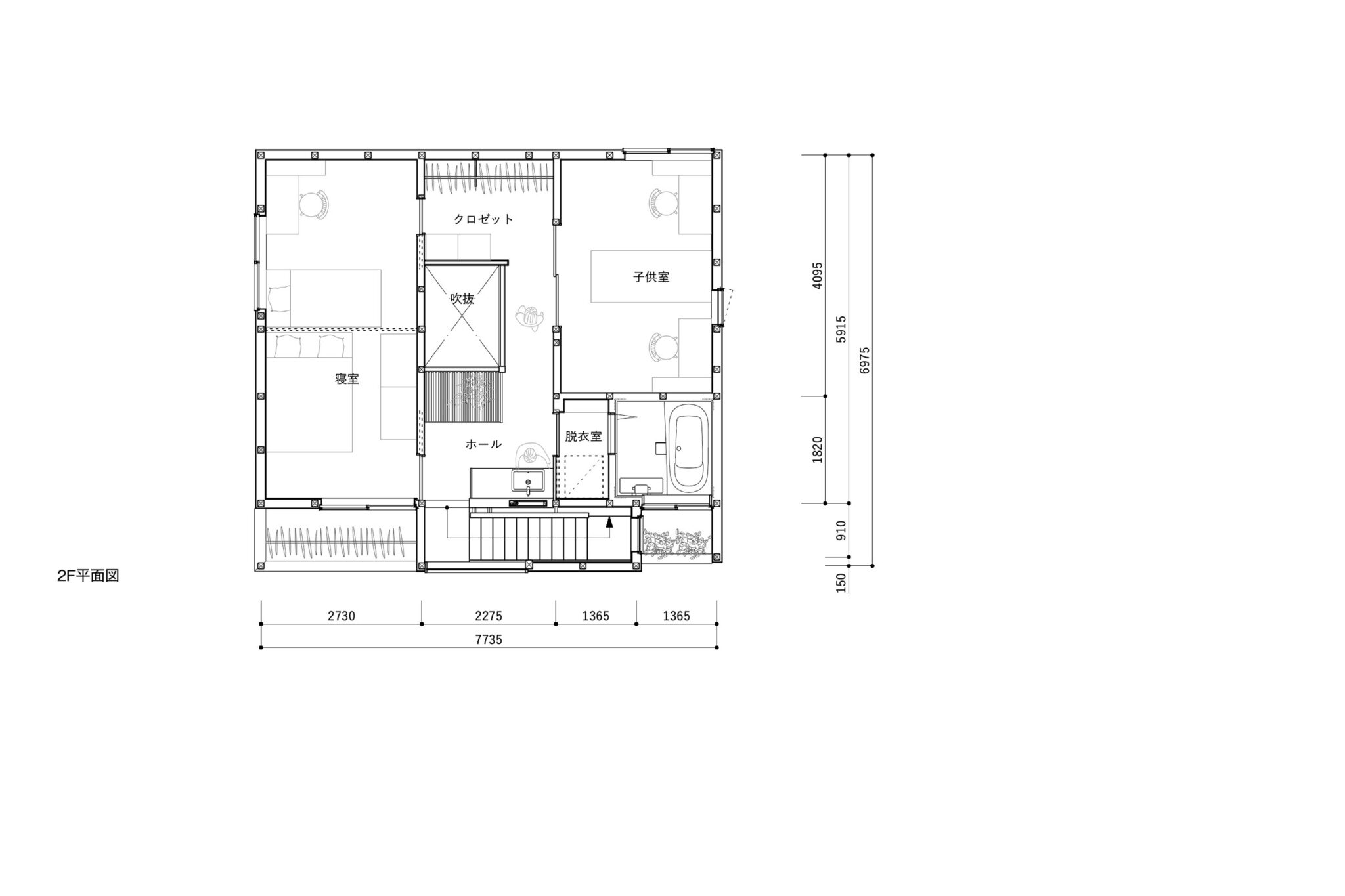 一色暁生建築設計事務所による、大阪・吹田市の「佐井寺の家」。標準像としての“ニュートラルな日本の住まい”も目指した計画。伸びやかな暮らしを求め、内外が完全に隔てられていない“透け感をもつ”建築を志向。日本家屋の意匠を“現代的に解釈”した要素でつくり上げる2階平面図 image©一色暁生建築設計事務所