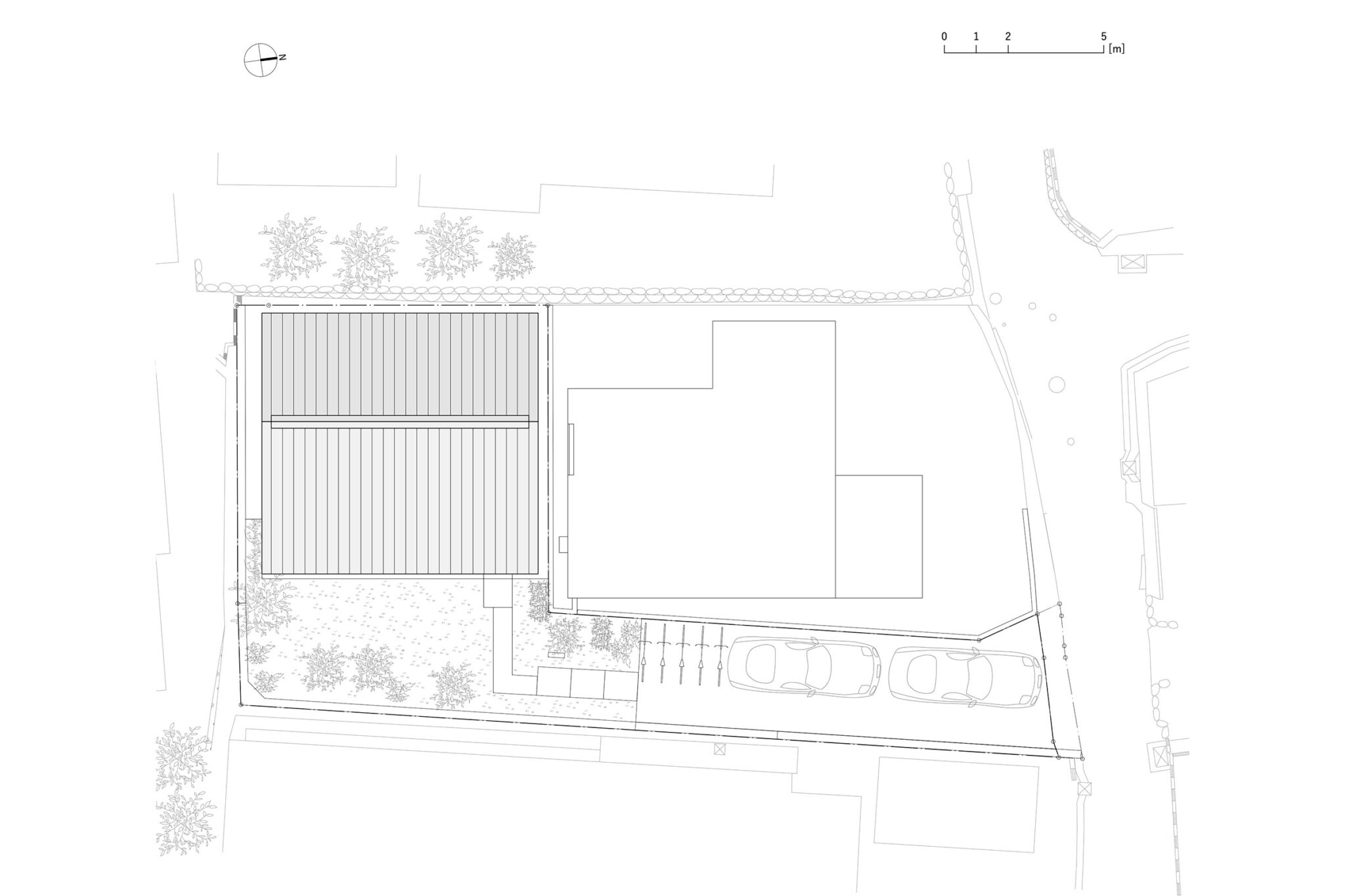 一色暁生建築設計事務所による、大阪・吹田市の「佐井寺の家」。標準像としての“ニュートラルな日本の住まい”も目指した計画。伸びやかな暮らしを求め、内外が完全に隔てられていない“透け感をもつ”建築を志向。日本家屋の意匠を“現代的に解釈”した要素でつくり上げる配置図 image©一色暁生建築設計事務所