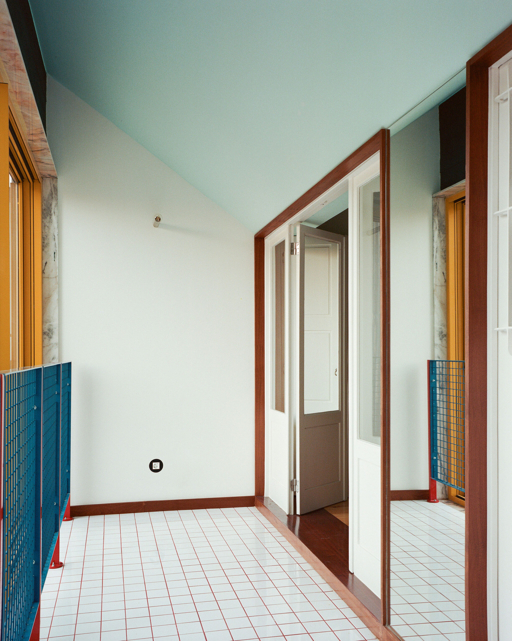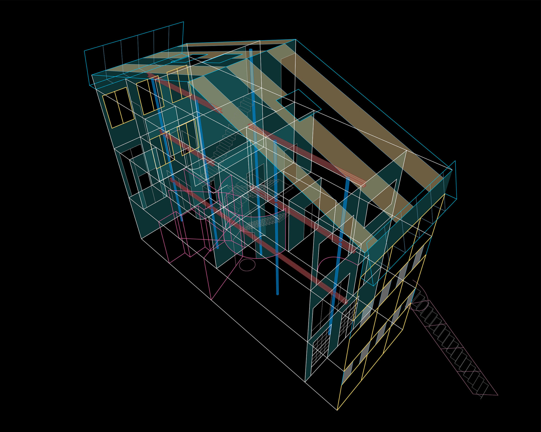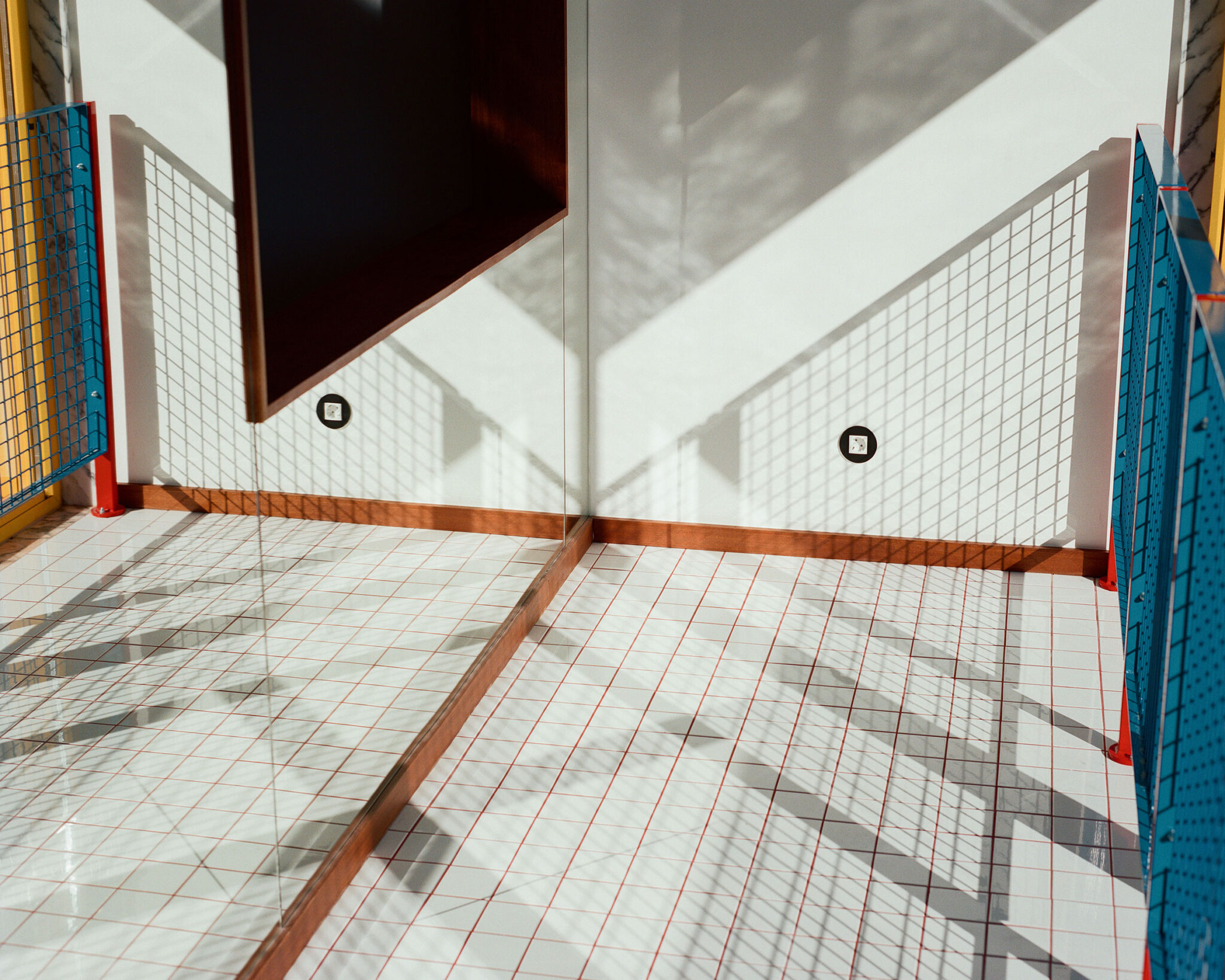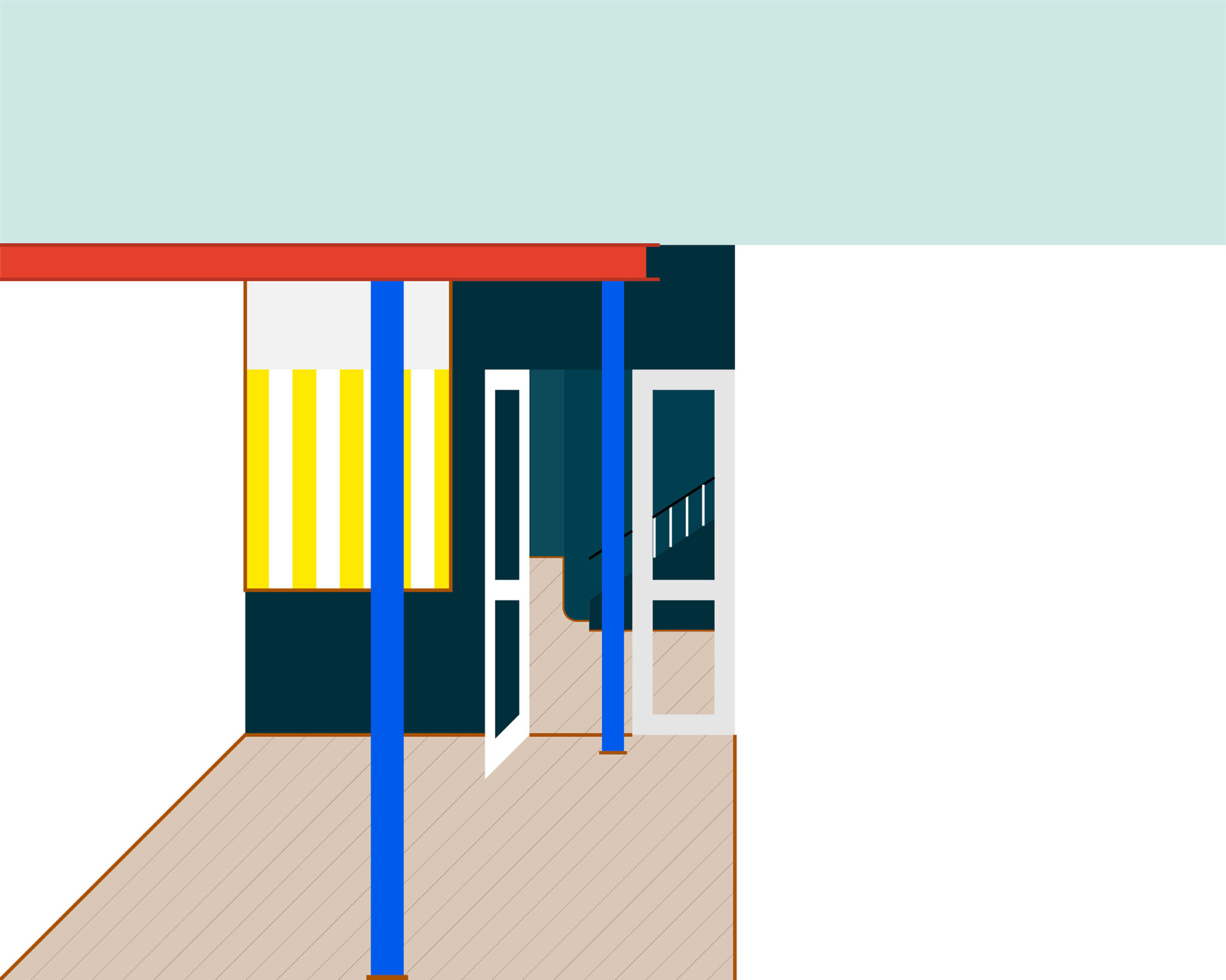 The new structure enters the existing building on its own terms. A row of thin metal poles carries an I-beam stretching from front to back. When needed, beams are interrupted. These cuts are exposed and celebrated. The new elements are painted in bright red and blue. They occupy positions within the space that are deliberately disruptive, blocking doors, windows and passages. Because of that inconvenience the structure becomes visible. It is an active participant of the space.
