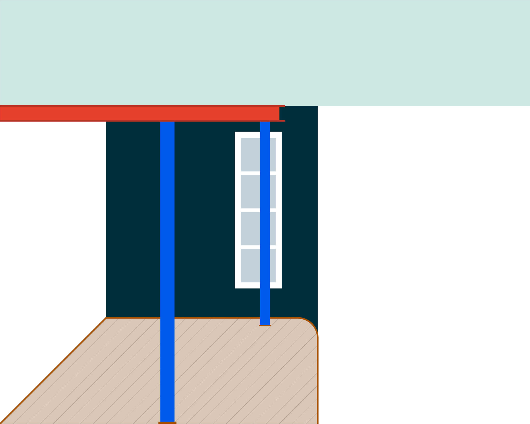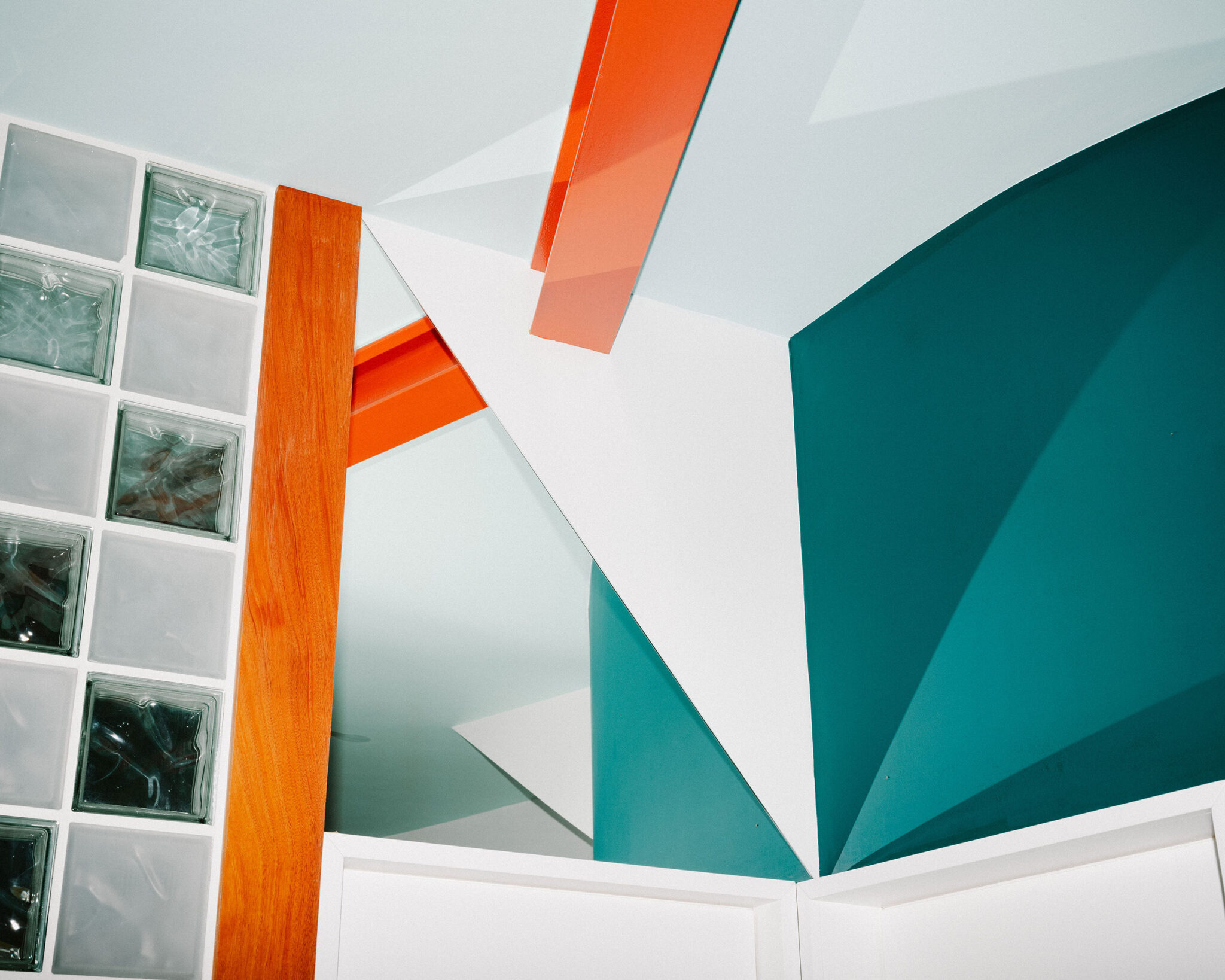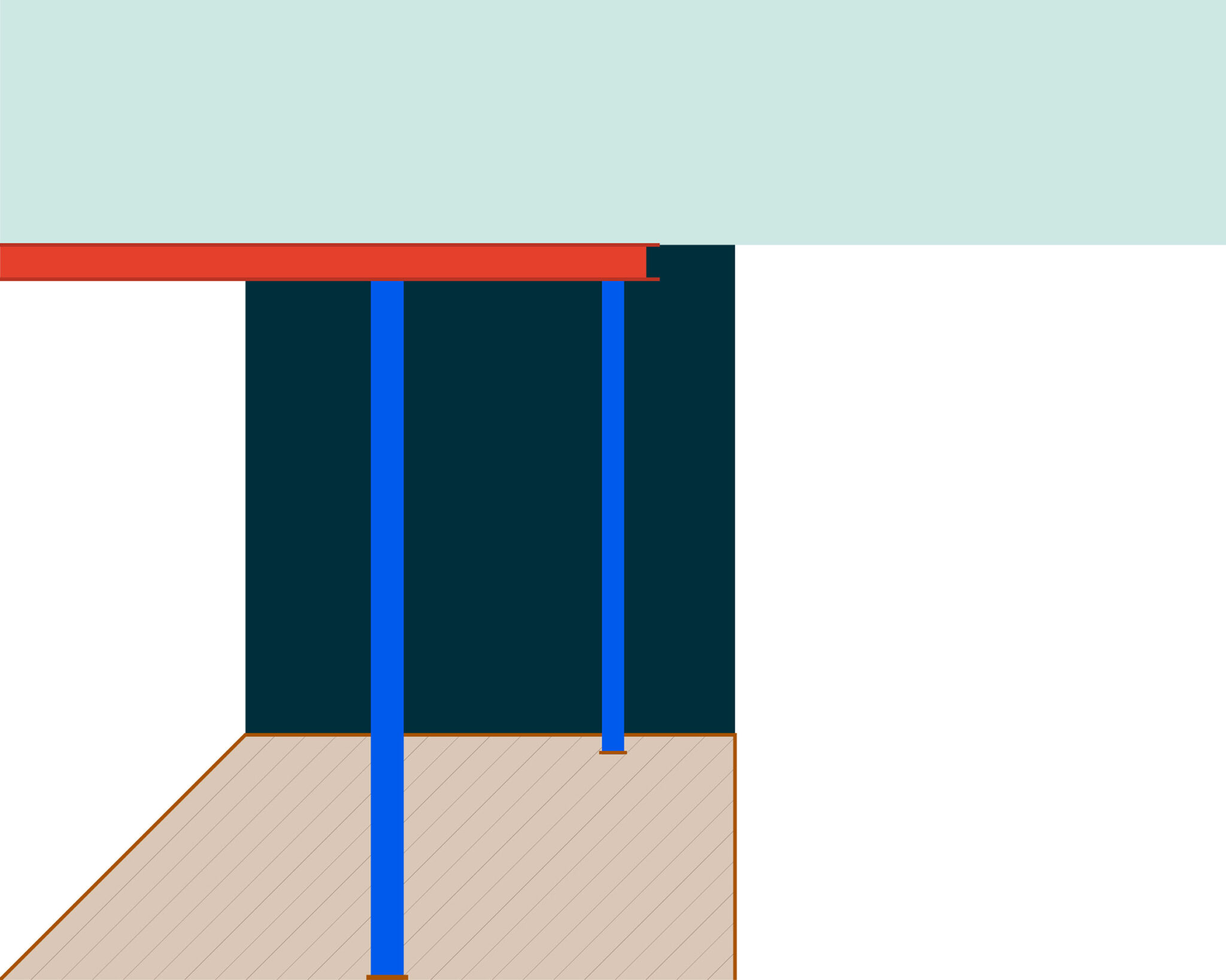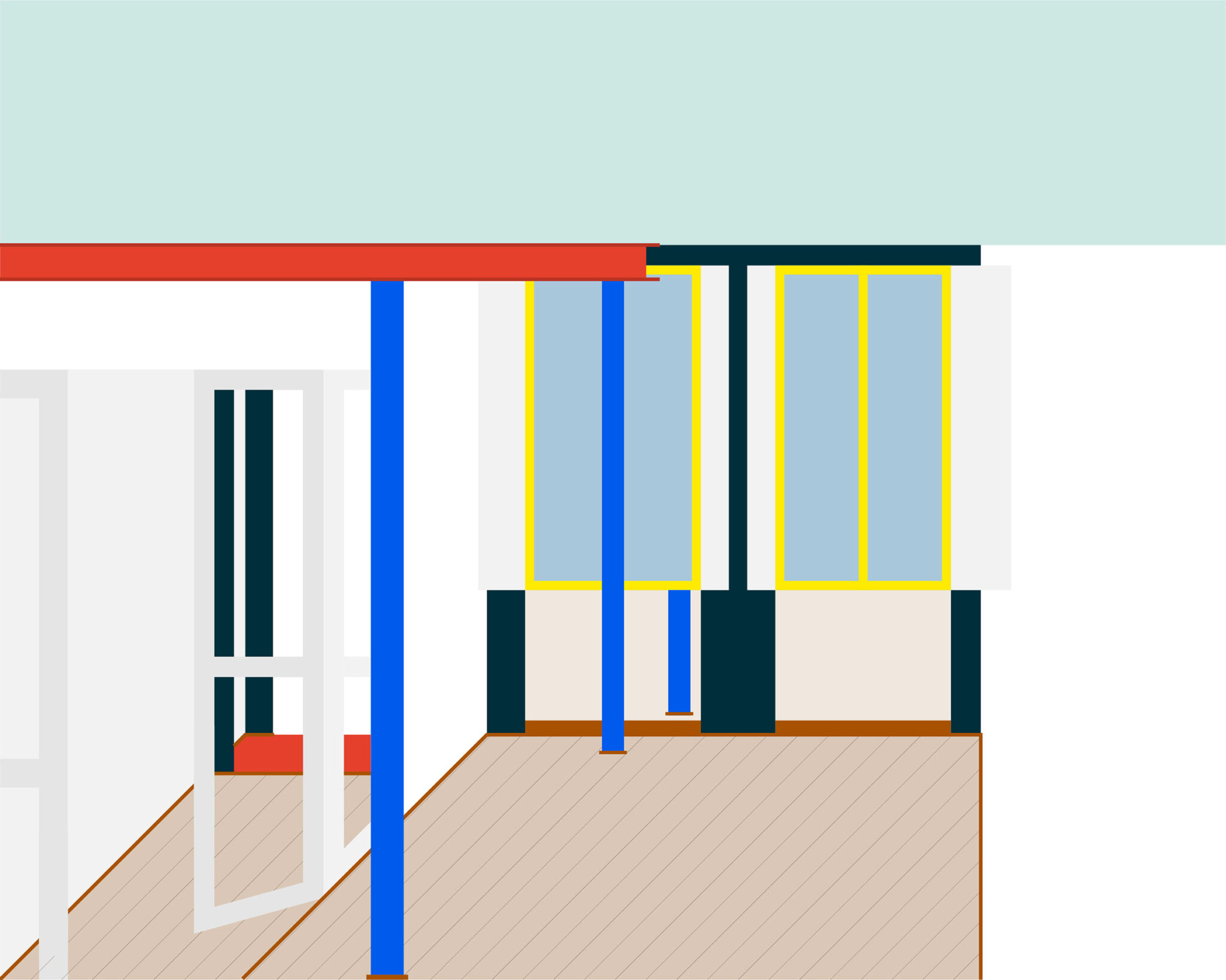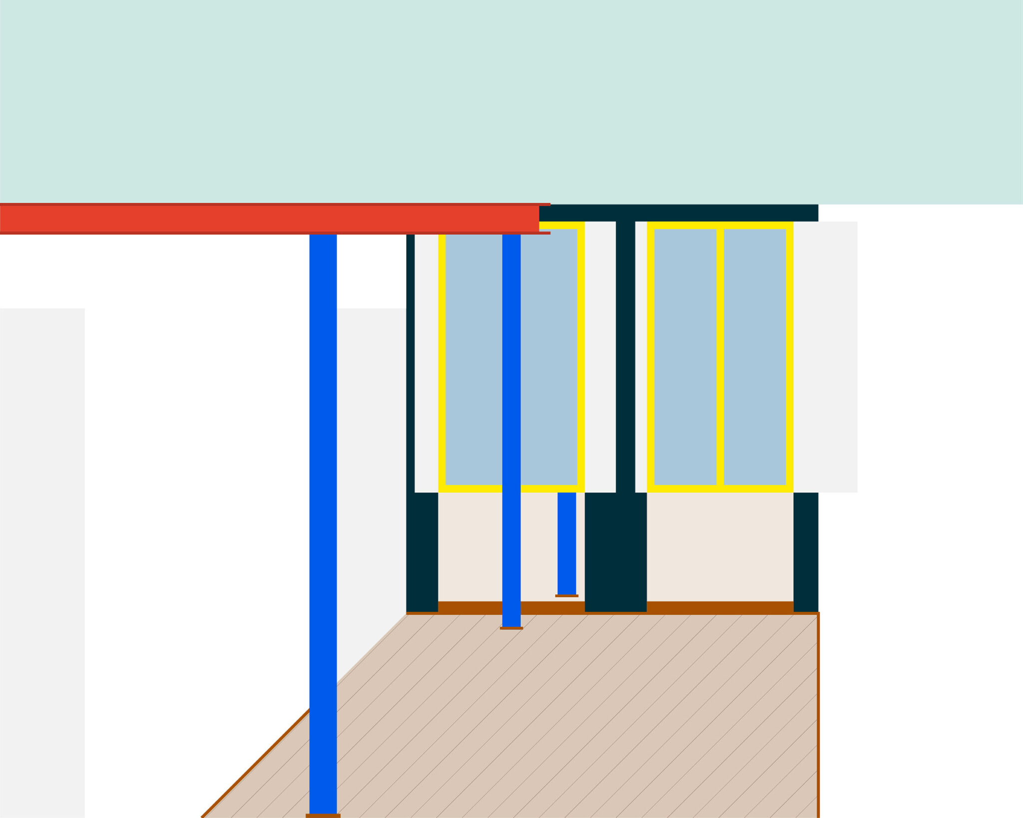 The new structure enters the existing building on its own terms. A row of thin metal poles carries an I-beam stretching from front to back. When needed, beams are interrupted. These cuts are exposed and celebrated. The new elements are painted in bright red and blue. They occupy positions within the space that are deliberately disruptive, blocking doors, windows and passages. Because of that inconvenience the structure becomes visible. It is an active participant of the space.