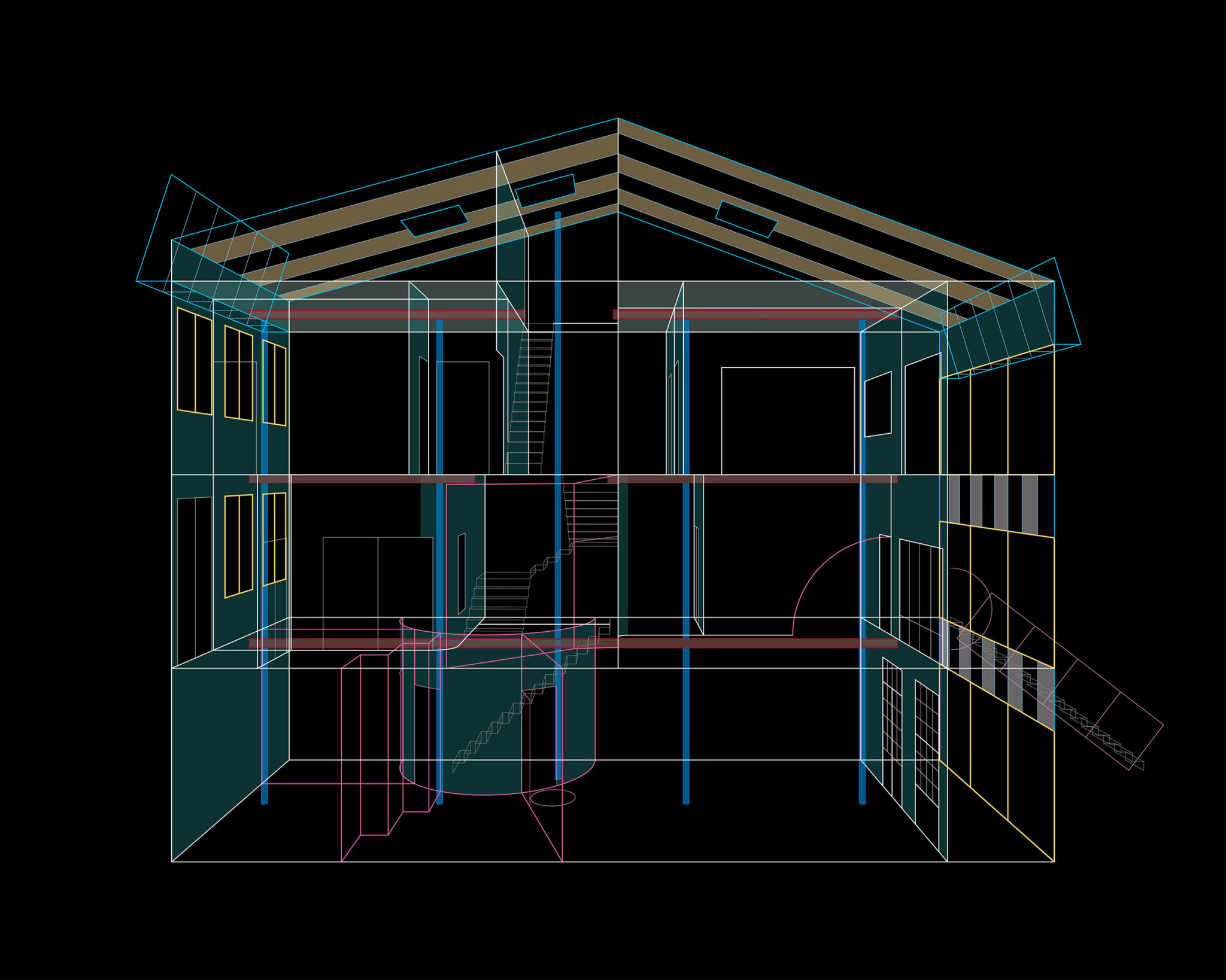 The project is made with lines and surfaces, both approached in a way that is systematic but excessive. The existing spaces are reimagined with lines of wooden skirting, yellow frames, and dense metal mesh. Colours are let loose. Each room is disassembled into sides of white, light green, and dark blue paint. Mirrors are applied where the edges do not quite meet. Mistakes result in the multiplicity of reflective surfaces. The resulting space is abundant and complex, yet every room, fragment, or corner within the house follows the same logic. The fragmented project is taken apart in order to be reassembled with a different system, to suggest a different reading of an existing building.