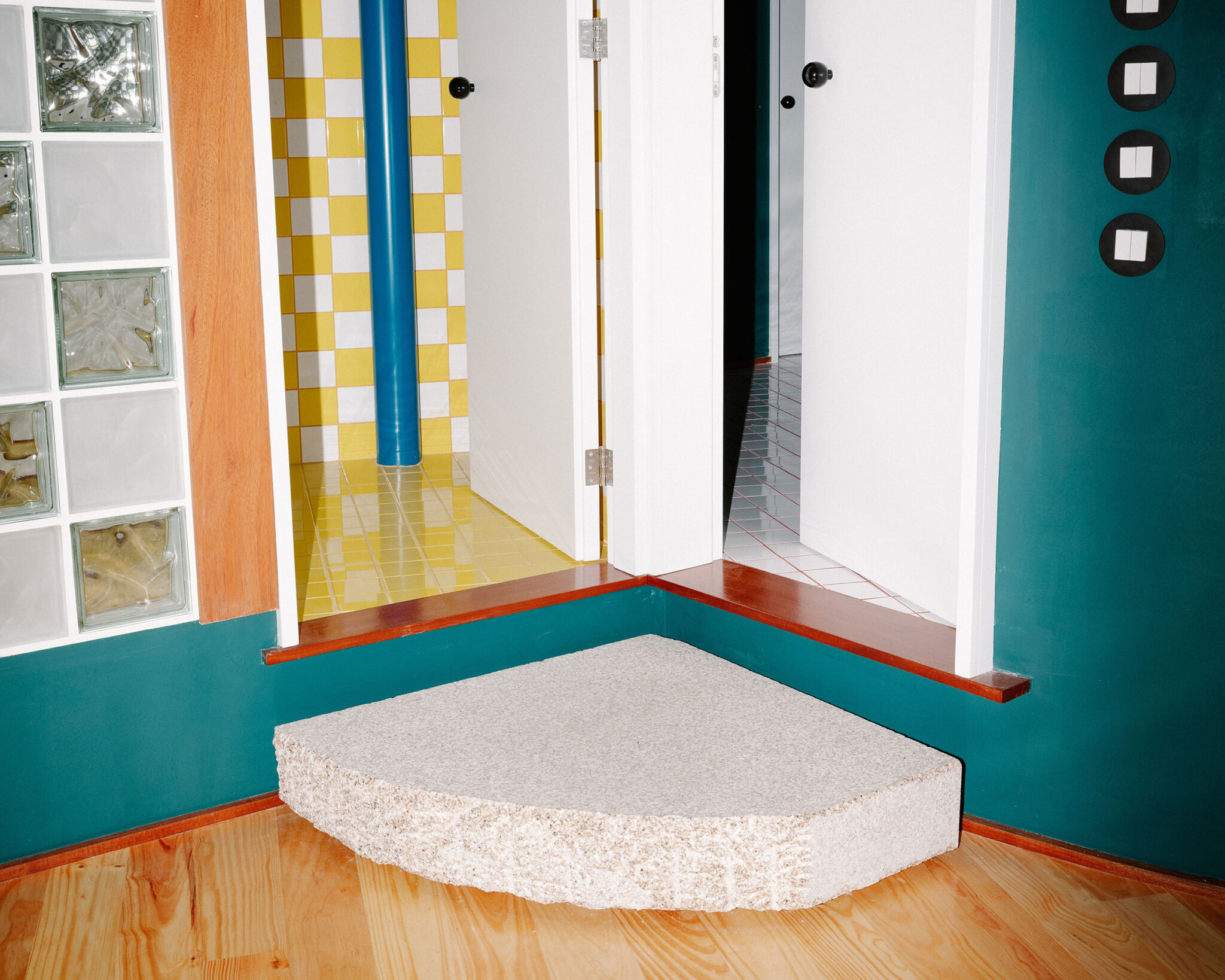 Besides the structure, the building required a few fragmented interventions. Within the interior space, very little was demolished, and a couple of strategic walls were added. Towards the street, the building acquired a reflective hat, towards the back a new translucent layer mitigates the question of insulation, offering an enclosed balcony on each level, and a new mask, made of glass, yellow frames, stripes of mirror, and marble.