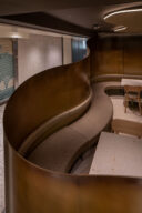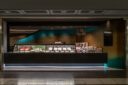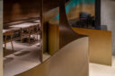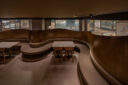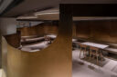地下街の細長い区画での計画です。建築家は、“上質な空間体験”を求め、高さを変えながら湾曲する“6mmの鉄板”壁で“奥行きと陰影”を創出しました。また、上がり天側に各種設備をまとめた“折上天井”として“美しい仕上げ”の水平面もつくり出しています。店舗の場所はこちら(Google Map)。