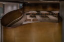 今回、壁を金属板による仕上げとしたことで、その規格により等間隔に目地が現れるため、床や天井に余計なラインが現れることは相応しくないと判断した。そこで、床は目地を必要としない特殊なテラゾー仕上げとし、天井に所狭しと設けなければならない各設備は、折上天井を設けその上がり天側に集中させ、下がり天側には一切の設備が付かない美しい仕上げとなるよう配置をコントロールした。