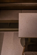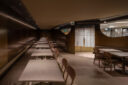 吉村靖孝とナノによる、愛知・名古屋市の「鈴波 栄 森の地下街店」。地下街の細長い区画。“上質な空間体験”を求め、高さを変えながら湾曲する“6mmの鉄板”壁で“奥行きと陰影”を創出。上がり天側に各種設備をまとめた“折上天井”として“美しい仕上げ”の水平面もつくり出す「膳処」、家具と床の詳細 photo©トロロスタジオ
