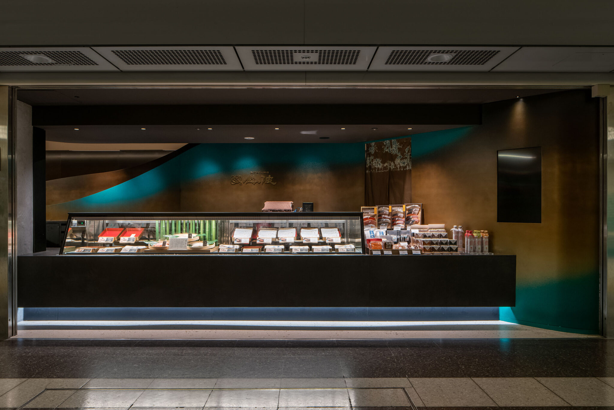 吉村靖孝とナノによる、愛知・名古屋市の「鈴波 栄 森の地下街店」。地下街の細長い区画。“上質な空間体験”を求め、高さを変えながら湾曲する“6mmの鉄板”壁で“奥行きと陰影”を創出。上がり天側に各種設備をまとめた“折上天井”として“美しい仕上げ”の水平面もつくり出す